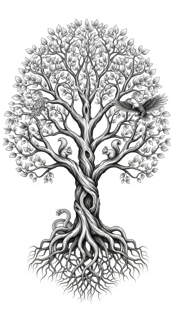 A tattoo concept that weaves the quoted text into the design: the tree rendered in fine-line blackwork with its roots encircling a stylized Norse knot; the trunk incorporates a subtle script band of the exact quoted text in a clean serif around the core; branches stretch into three circular spheres representing the Nine Worlds, filled with dotwork galaxies and rune accents; small animals (a stag, an eagle, a serpent) sit among limbs. Symbolically the tree and spheres emphasize connection, cycles, and balance; the preserved original wording down the trunk anchors personal meaning and lineage, blending ancient wisdom with contemporary aesthetics. Ideal placement: forearm wrap, upper chest over the heart, or vertical along the spine for a strong central axis and visibility of the script.