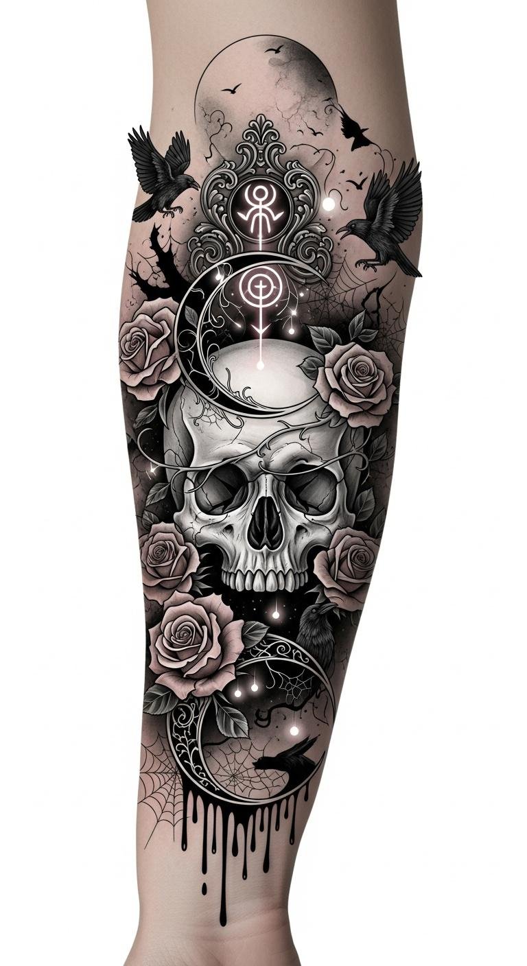 This design pairs the text’s tone with imagery: the central skull represents mortality, wilting roses and ravens add mourning and transition, filigree and sigils evoke dark romance and the supernatural, while dripping shadows and negative-space crescent create mystery and movement; emotionally it balances melancholy and acceptance.