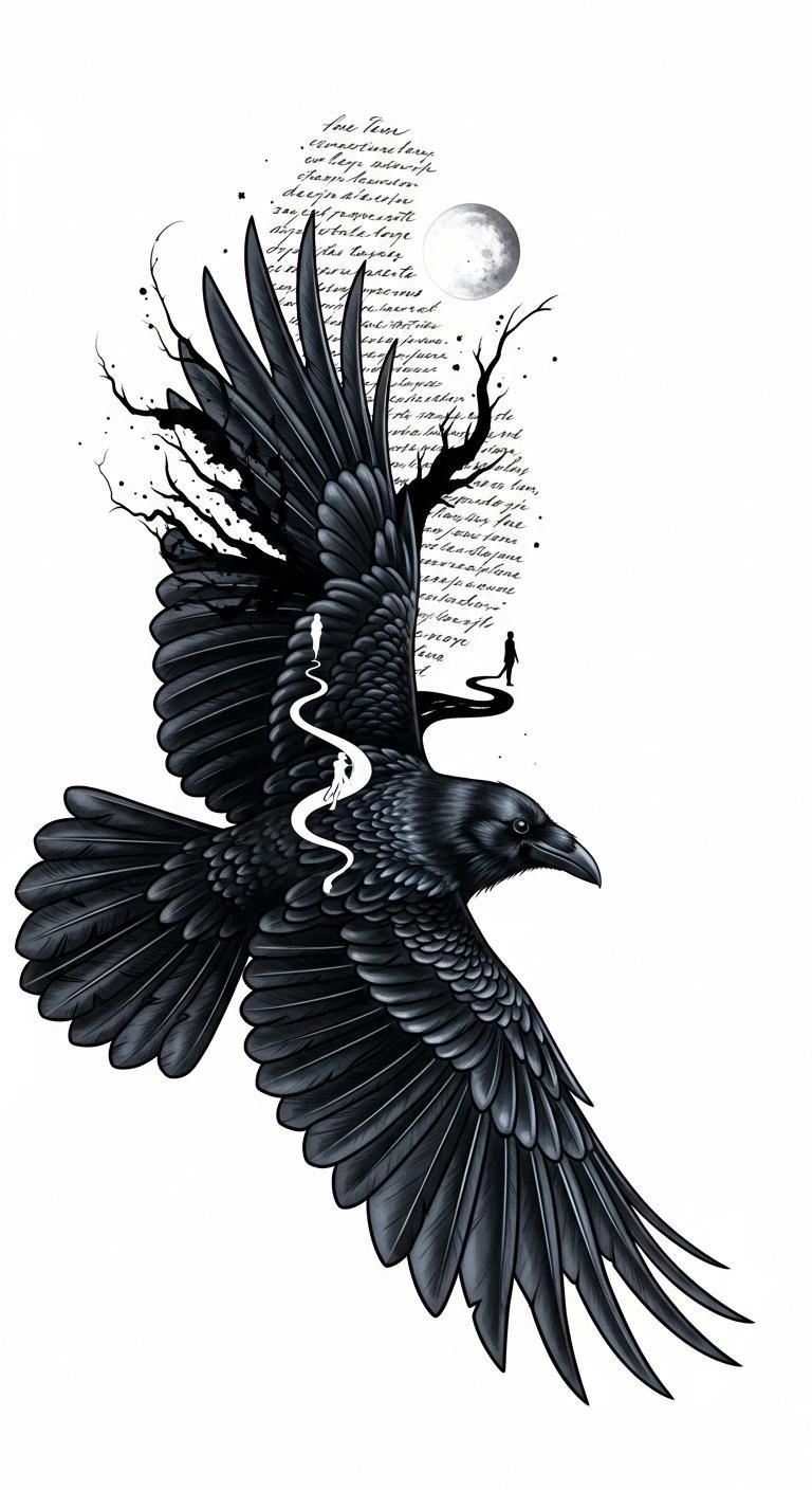 Emerging from the shadows of mortality, ravens soar as enigmatic messengers, linking our world to the domains beyond.