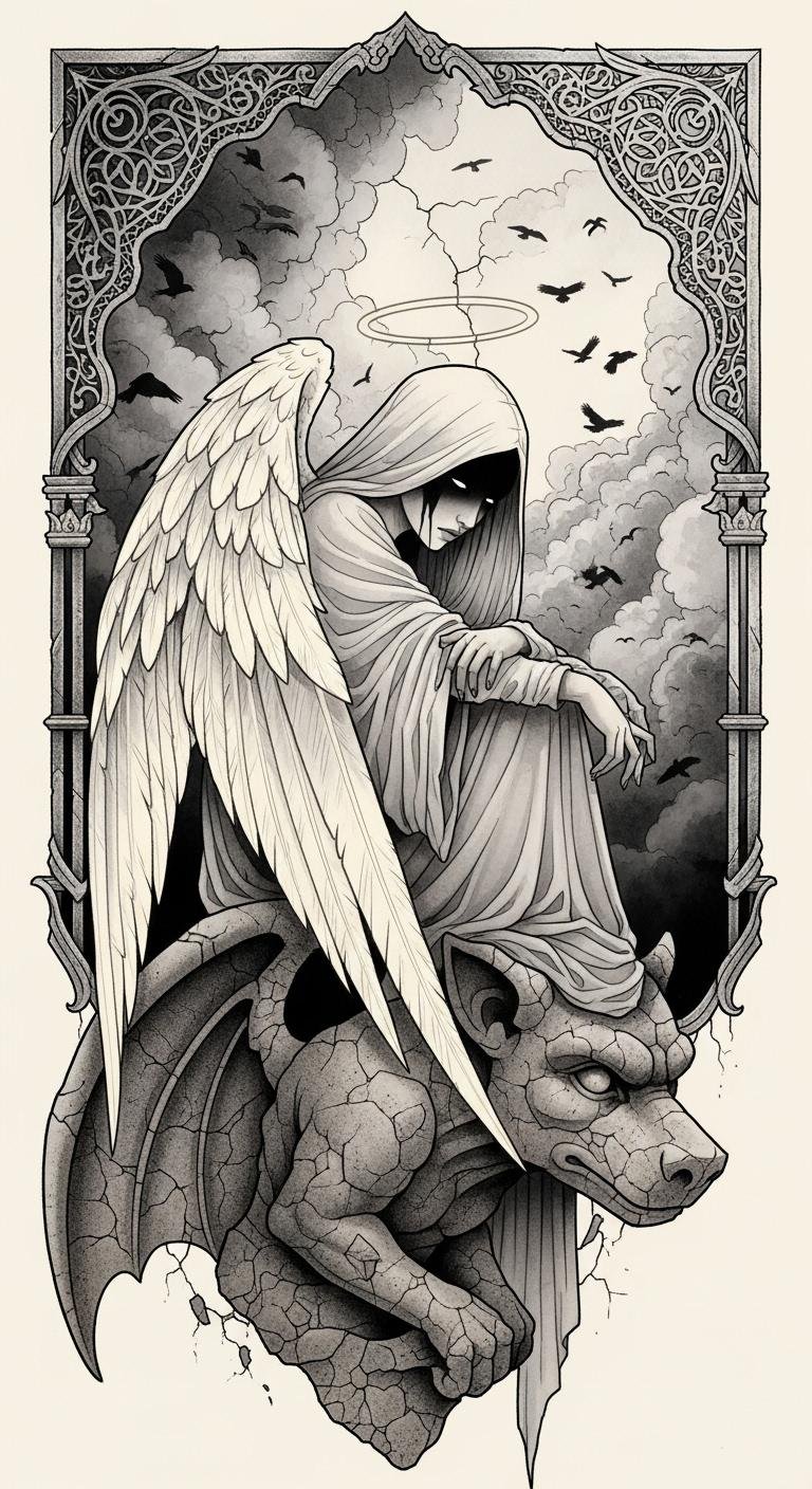 These tattoos invite you to explore the balance between darkness and light, reminding you of the freedom within contemplation, where beauty blooms amidst the haunting whispers of the unknown. This design emphasizes inner conflict and serenity—wings protect yet reveal vulnerability, the cracked halo hints at imperfect divinity, and surrounding crows and ruins suggest memory and mourning.
