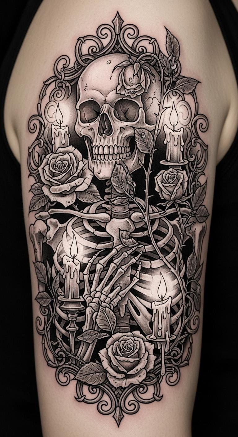 This design uses the skeleton and wilting roses to symbolize the interplay of decay and beauty, candles for transient illumination, and filigree to frame the tension; it evokes contemplative melancholy and quiet acceptance, suited to the upper arm or ribcage where curvature accentuates motion and intimacy.