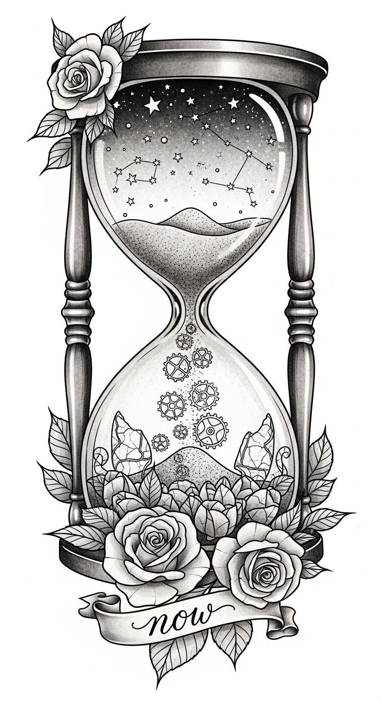 This design symbolizes the continuum of time and the acceptance of hardship as an element of beauty—the hourglass holds life’s fleeting moments while the thorns and rosebuds mark wounds turned into growth.