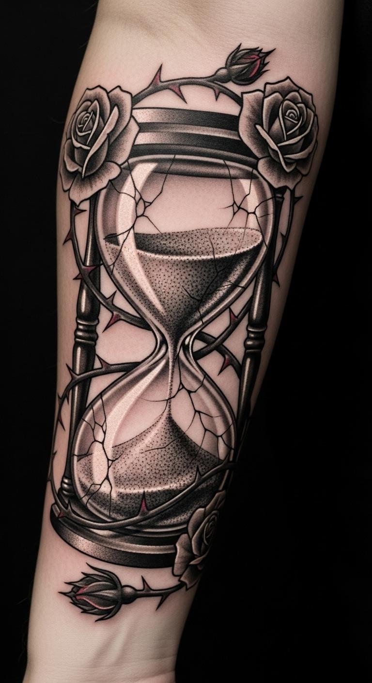 Emotionally it conveys quiet strength, elegiac acceptance, and the tension between vulnerability and endurance. Ideal placement is the outer or inner forearm wrapping toward the elbow so the hourglass sits central with vines curling around the arm, allowing flow with musculature and visibility for introspective or social display.