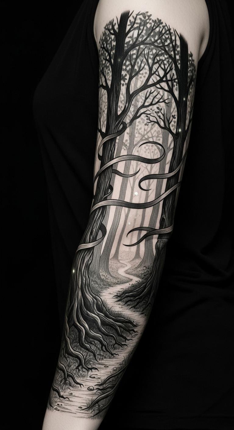 As a tattoo concept this design uses the original passage as the literal visual script: ancient trees and twisting shadows become the primary forms, shadow ribbons embody the seductive pull of mystery, and glowing motes give the scene an enchanted hush. Emotionally it balances curiosity and calm — the winding path evokes a personal journey and the freedom of stepping into the unknown, while the dense silhouettes maintain an aura of protective secrecy. Ideal placements are the forearm or along the spine/back where the vertical composition can wrap and flow with the body’s movement, allowing the shadows to travel and shift with your gestures.