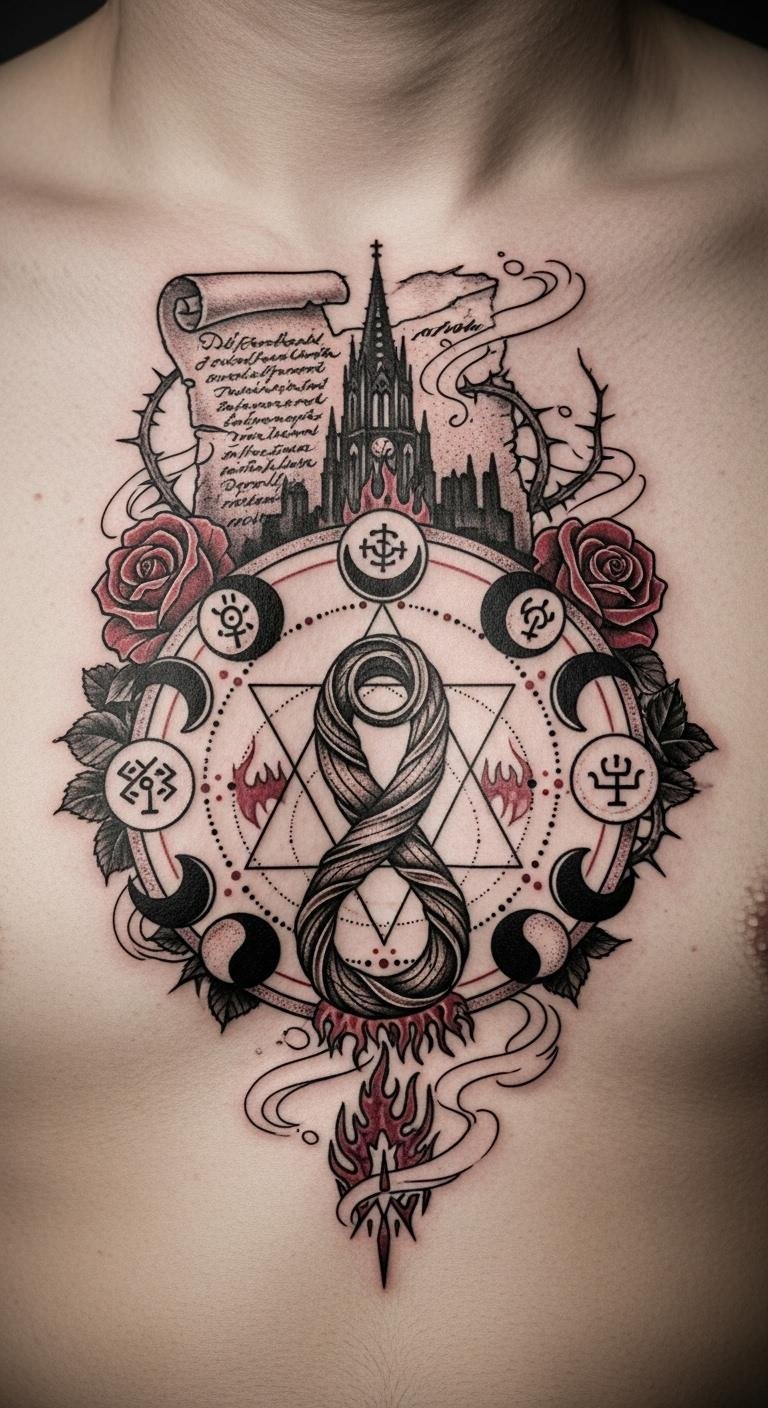 This placement centers the transformation over the sternum so the ouroboros aligns with the heart, the parchment and spire draw the eye upward to suggest spiritual ascent, and the surrounding thorns and ash evoke protective melancholy.