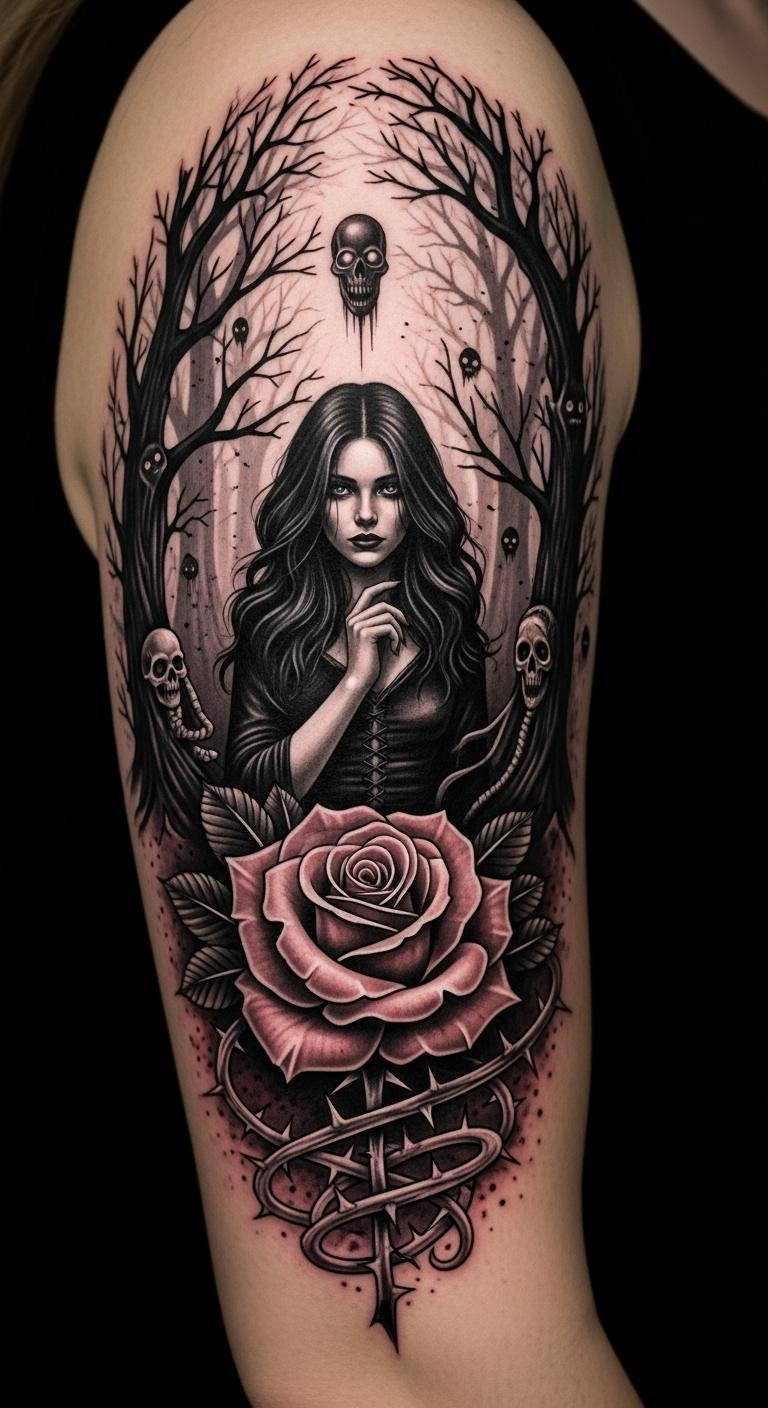 This design pairs a raven-haired maiden whose silhouette fades into curling, shadowy vines that form a haunted forest, with a single rose wrapped in barbed thorns at her heart; small glyph-like secrets and tiny hidden creatures nest in the negative space. It evokes melancholy wonder, the tension between allure and danger, perfect for a vertical forearm, ribcage, or back placement where the flowing lines can trail and the details can be read up close.