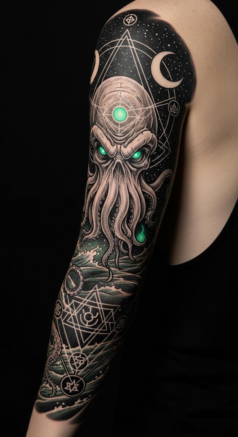 Let this tattoo serve as a bold declaration of your fascination with the eerie, the enigmatic, and the cosmic insignificance we all share. This design uses the towering Cthulhu visage and interlaced tentacles to evoke overwhelming cosmic scale, while geometric sigils and bioluminescent highlights inject otherworldly mystery; placement on the forearm creates a wrap-around narrative visible in motion, while upper back placement lets the piece read as a solitary, brooding tableau—intended to provoke unease, contemplation, and a reverent sense of smallness against the vast night.