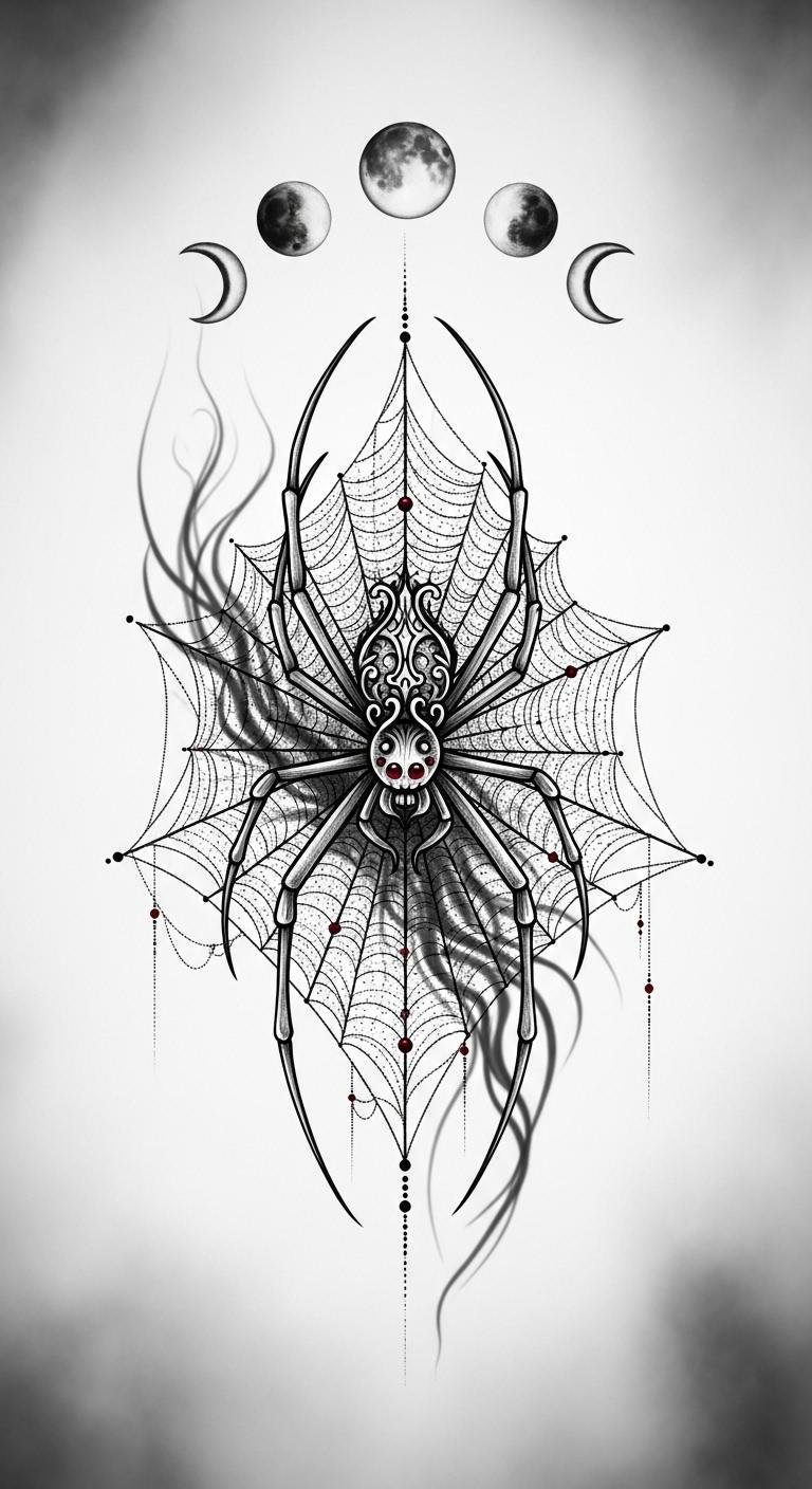 This design pairs symbolism of transformation, mystery, and protection with an emotive balance of elegance and menace; place on the upper back or sternum to allow the moon arc and web to flow with the body’s natural lines, or scale for forearm or calf as a personal talisman that evokes introspection and strength.