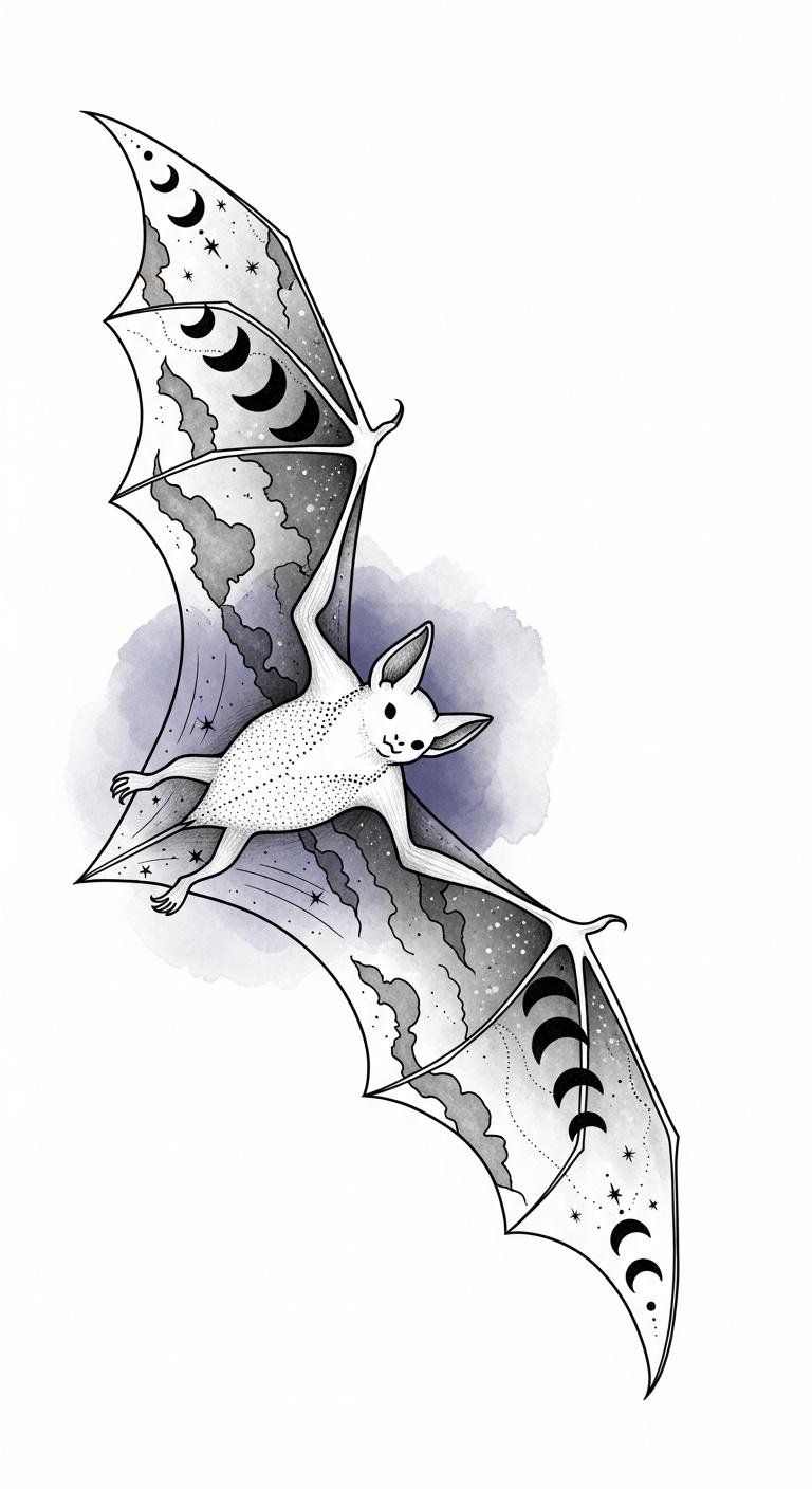 A bat tattoo can be a powerful reminder of embracing the night, inviting you to explore the mysteries lurking beyond the light. This design channels those themes—freedom and metamorphosis—through flowing wing shapes and moon-phase motifs that suggest cycles and renewal; the indigo watercolor evokes quiet introspection while the dotwork and subtle stars add delicacy and wonder.