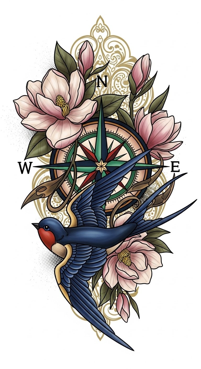 This design pairs the original sentiment with imagery that symbolizes guidance (compass), freedom and homecoming (swallow), and resilience and beauty (magnolia). Emotionally it communicates a confident, nostalgic elegance—a personal map of values and journeys. Ideal placement is the forearm for visibility and storytelling or the chest over the heart for intimate meaning; scale can be adjusted so the compass is the focal point with the swallow and blossoms wrapping naturally to follow musculature and movement.