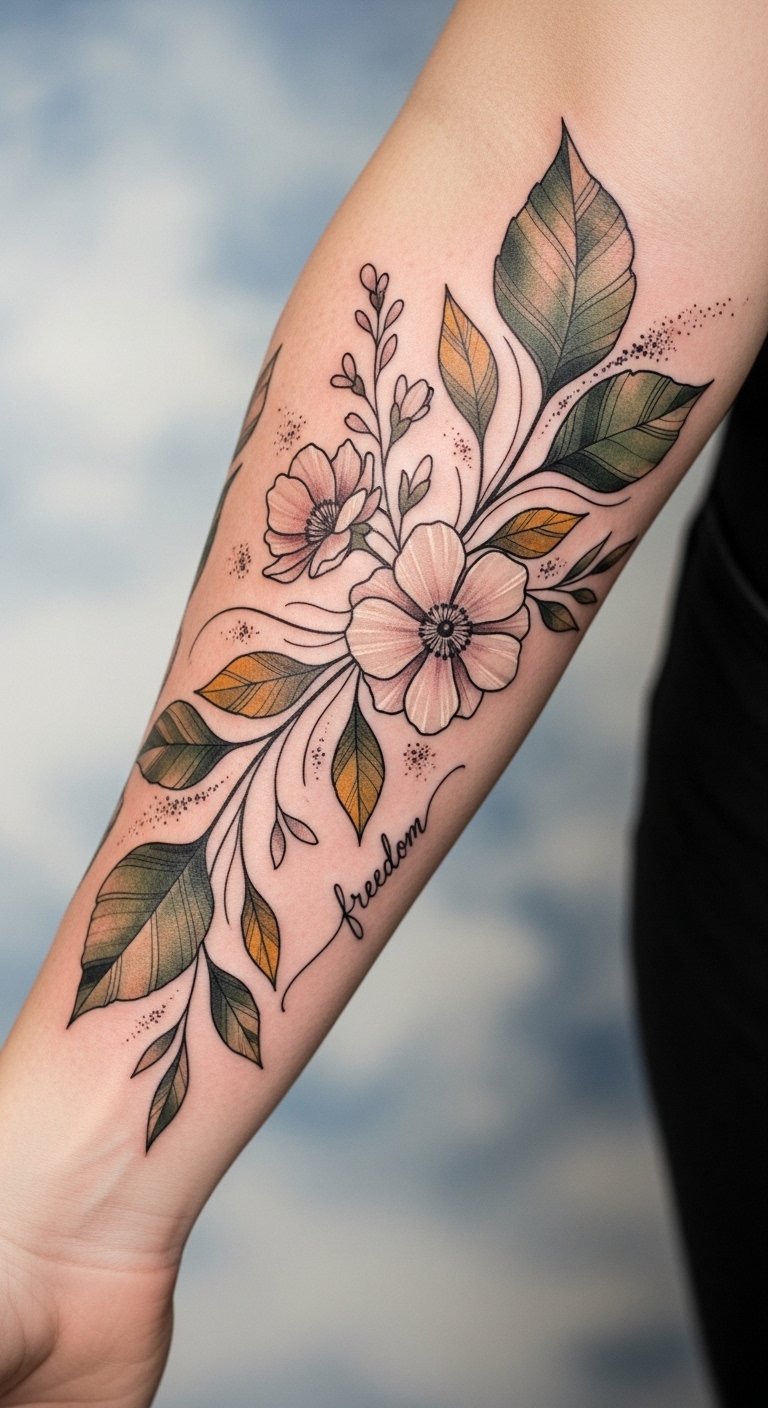 Let your ink bloom into a stunning representation of your connection to the earth and your desire for freedom. This design blends delicate flowers and bold foliage to symbolize growth and resilience; the watercolor washes evoke gentle emotion and the fine-line details convey clarity and intentionality.