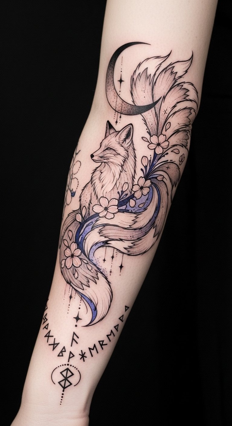 This forearm placement lets the fox’s tails flow with the arm’s natural movement, symbolizing transformation, cunning, and the passage between worlds; the crescent moon and runes convey guidance and ancestral memory, while the sakura petals add impermanence and beauty—emotionally evoking nostalgia, wonder, and personal myth-making, ideal for someone who wants a visible yet intimate narrative piece.