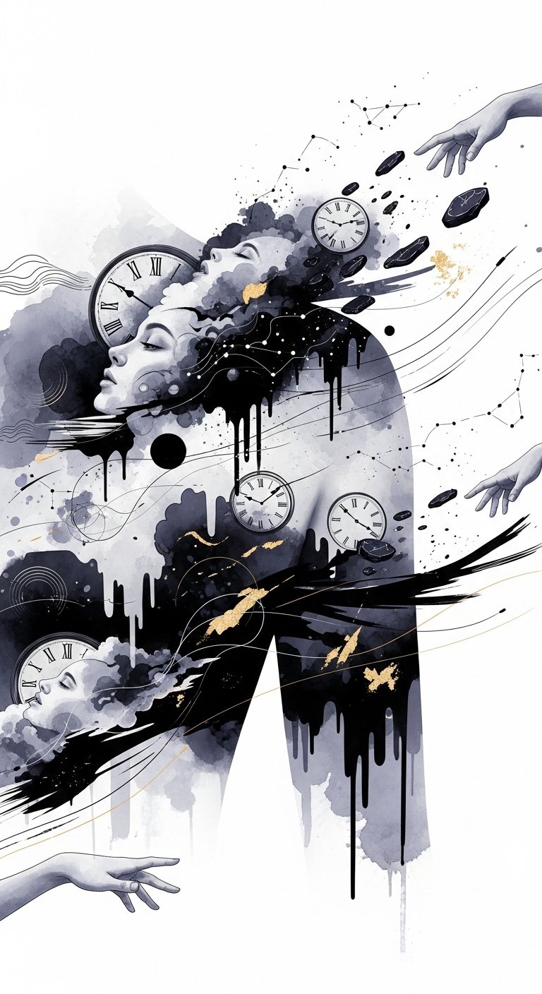 As you keep the original text intact within the image prompt, the tattoo concept translates the surreal, dreamlike language into visual symbolism: melting geometries and drifting clocks represent the fluidity of time and perception, ethereal faces and fragmented hands suggest the interplay between identity and subconscious yearning, while constellations and gold accents hint at guidance and personal mythology. Emotionally the piece balances mystery and liberation, inviting introspection and a sense of wonder; its painterly textures convey movement and vulnerability, and the strong contrasts emphasize moments of clarity amid ambiguity. Placement wrapping from shoulder blade to upper arm allows the design to unfold organically with the body’s contours, giving the wearer a private landscape that reveals itself in motion.