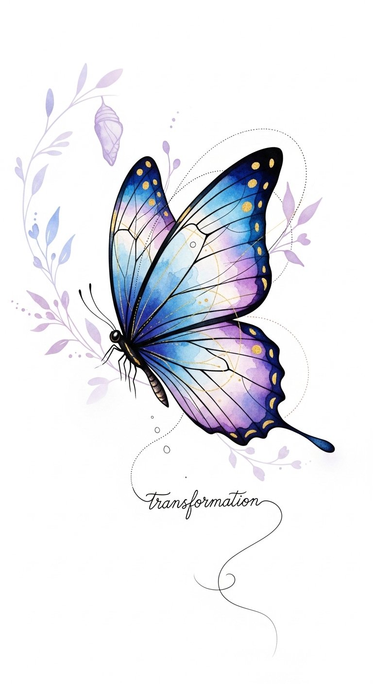 This design blends watercolor softness and precise linework to evoke both fragility and resilience; the chrysalis and floral elements suggest stages of growth while the gold accents add warmth and triumph.