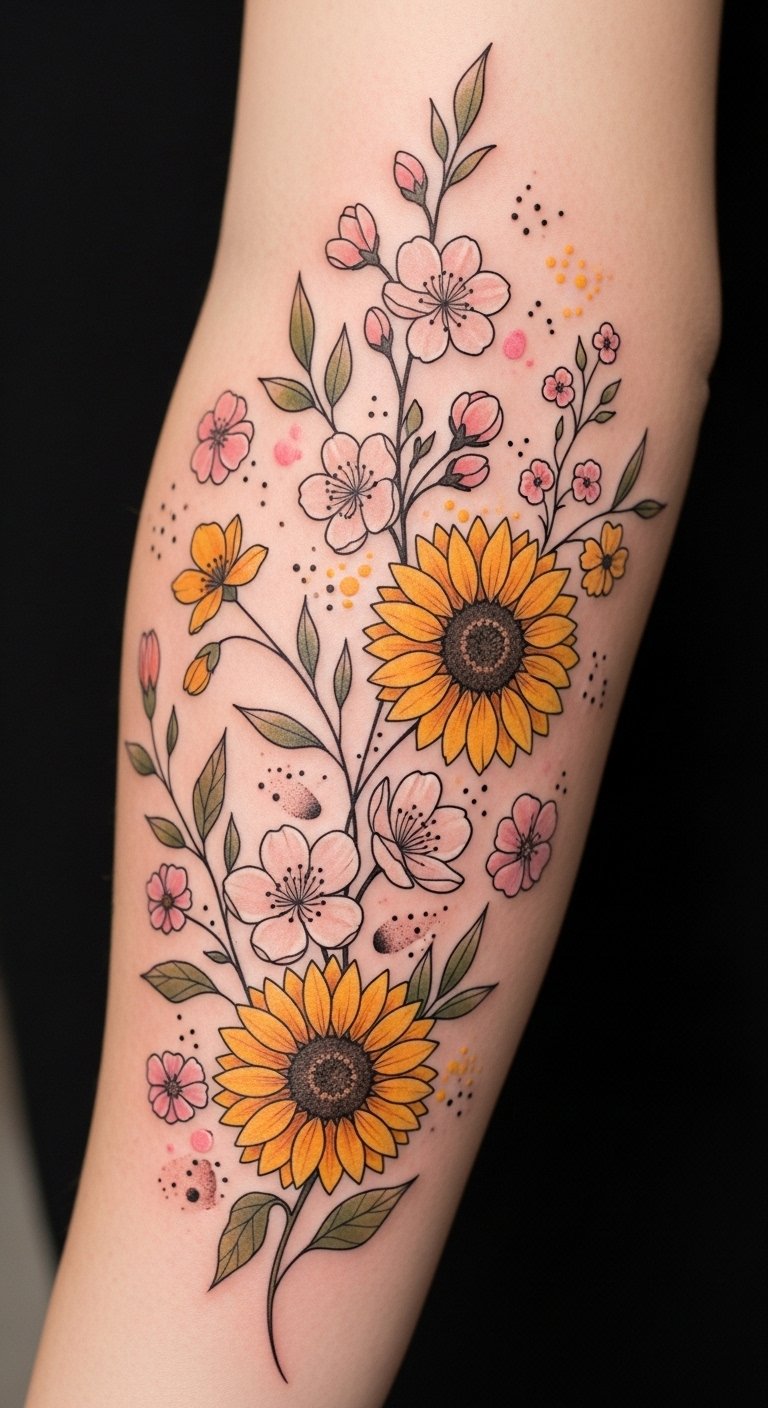 This design symbolizes renewal, resilience, and the passage of time—cherry blossoms for transience and new beginnings, sunflowers for strength and steadfastness, and wildflowers for spontaneity and personal freedom.