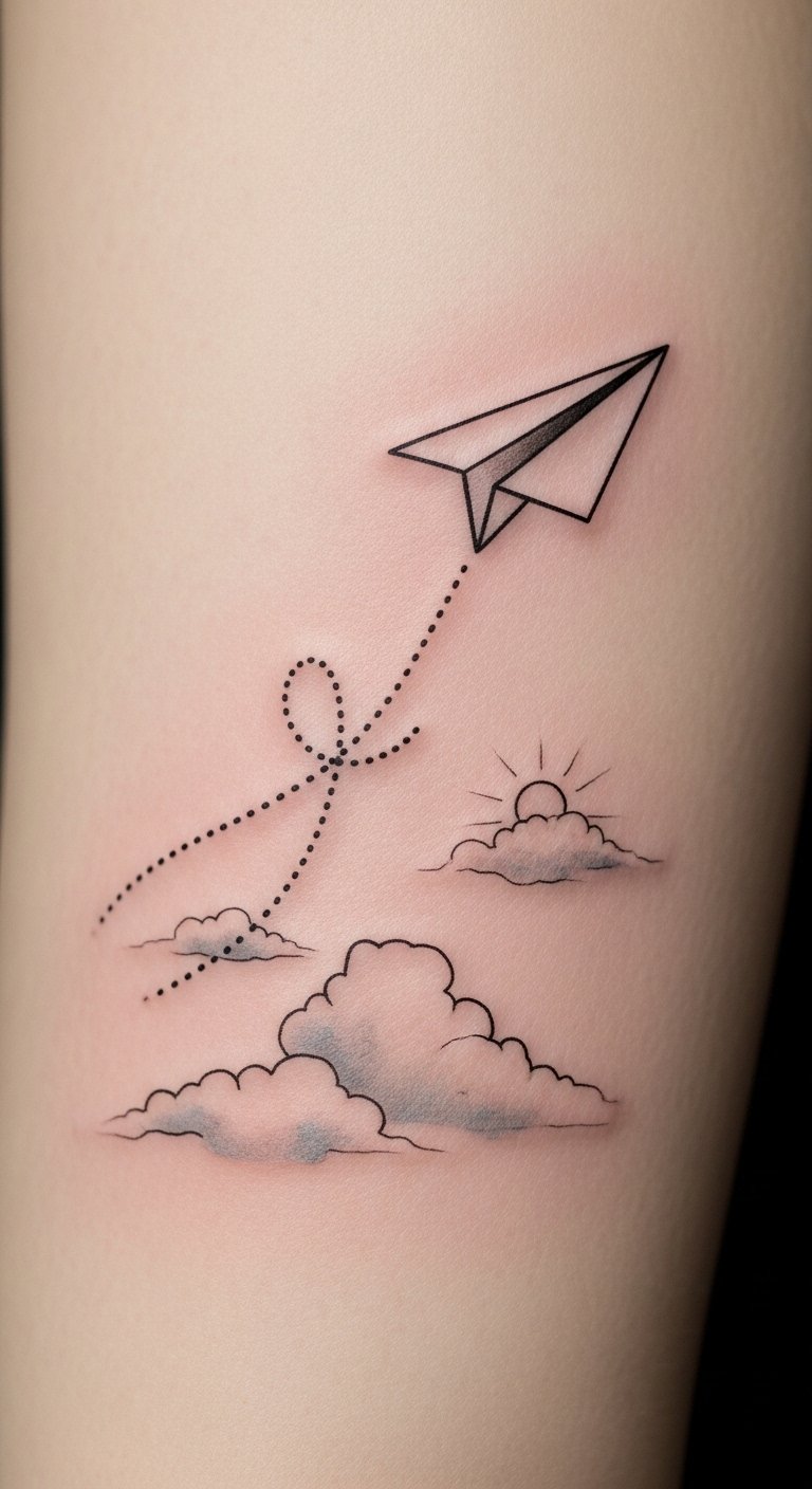 These tattoos capture the essence of freedom symbolism, inviting you to embrace life’s journeys. With every flight, they evoke adventure motifs that spark your imagination. A paper airplane tattoo isn’t just ink; it’s a declaration of your desire to soar beyond limits and chase the horizon.