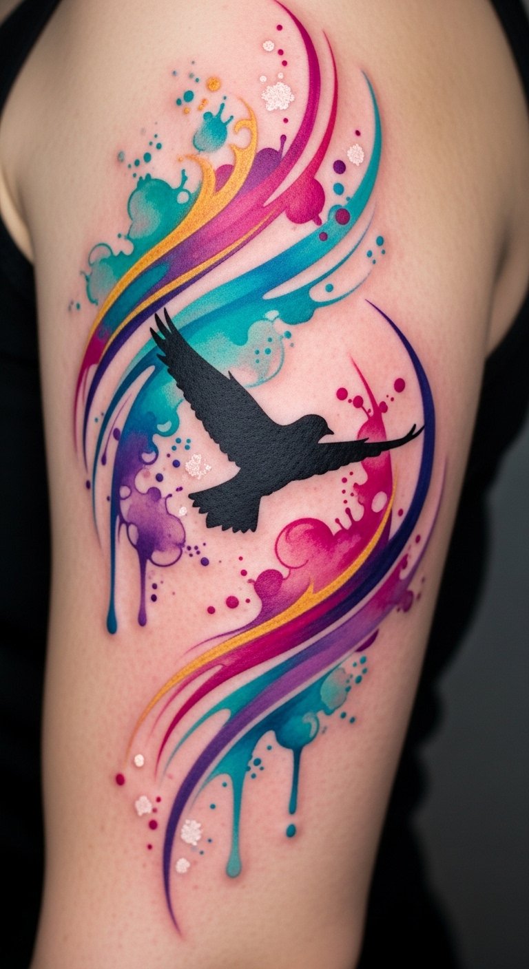 Tattoos can be more than just symbols; they can transform your skin into a canvas of vibrant art. This design pairs the original sentiment with a soaring bird rendered in negative space, surrounded by the described watercolor washes to symbolize liberation, personal growth, and the unfolding of one’s story; emotionally it feels like release and joyful expression.