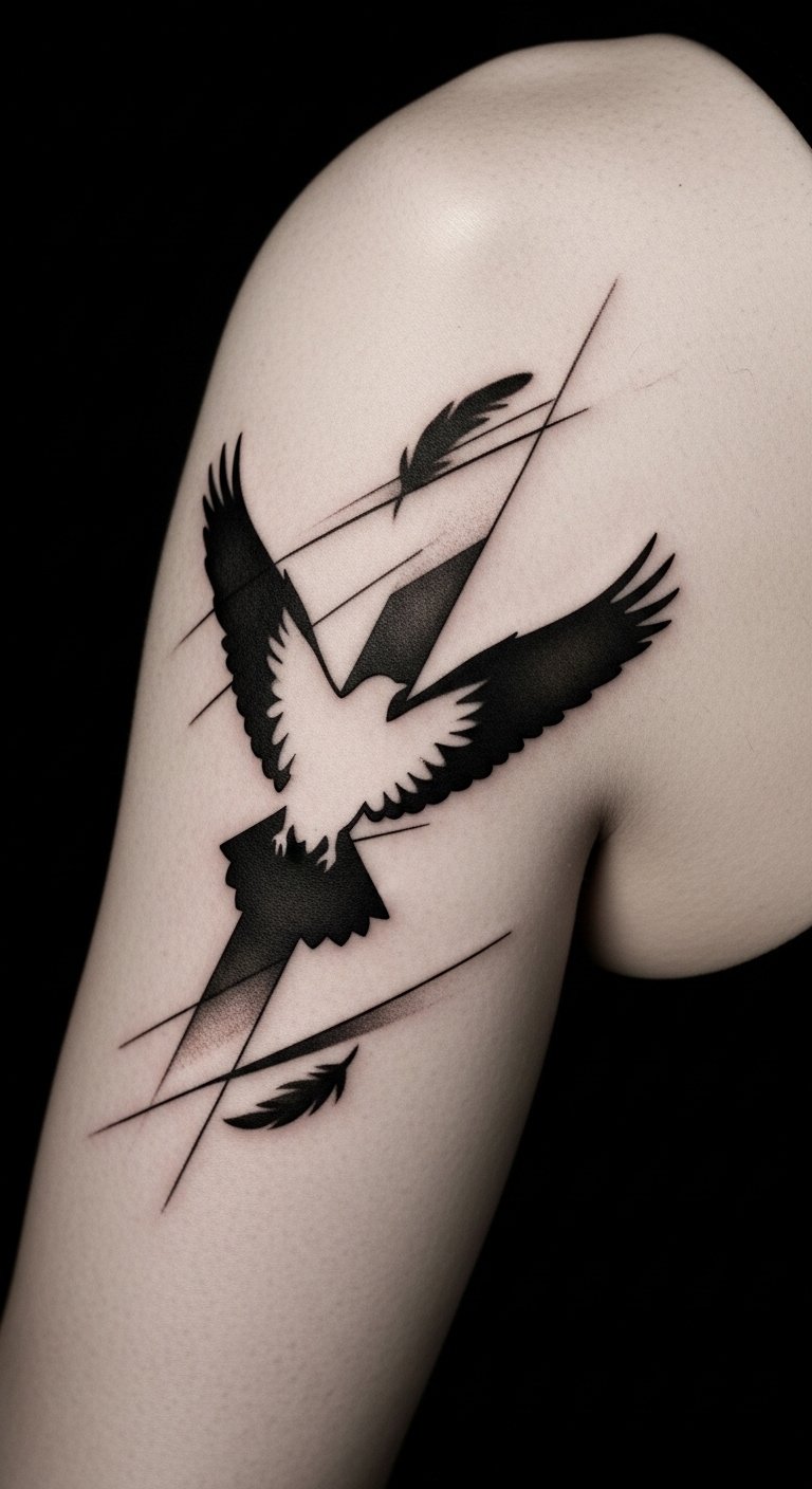 The design uses the untouched skin bird silhouette to symbolize liberation and individuality, while the surrounding shadow shapes evoke motion and transition; emotionally it balances boldness with subtlety, making it a statement piece best placed where it can flow with natural movement—along the forearm to extend with the arm’s motion or centered on the upper back for a strong, contemplative focal point.