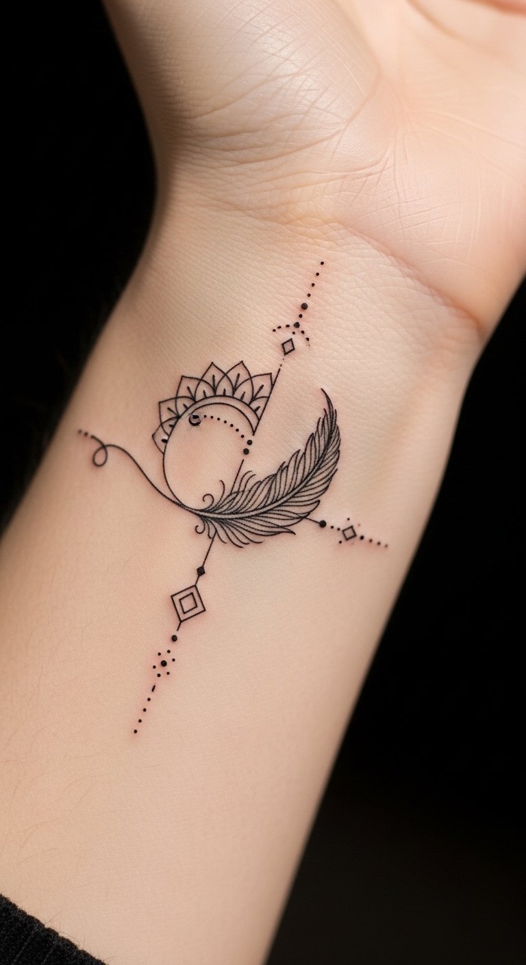 Tiny dots and micro-geometry accentuate moments of thoughtfulness and clarity; the single-line continuity emphasizes life’s unbroken journey. Emotionally intimate and quietly expressive, this placement on the inner wrist offers a personal reminder visible to the wearer yet subtle to others—ideal for someone seeking understated sophistication and meaning.