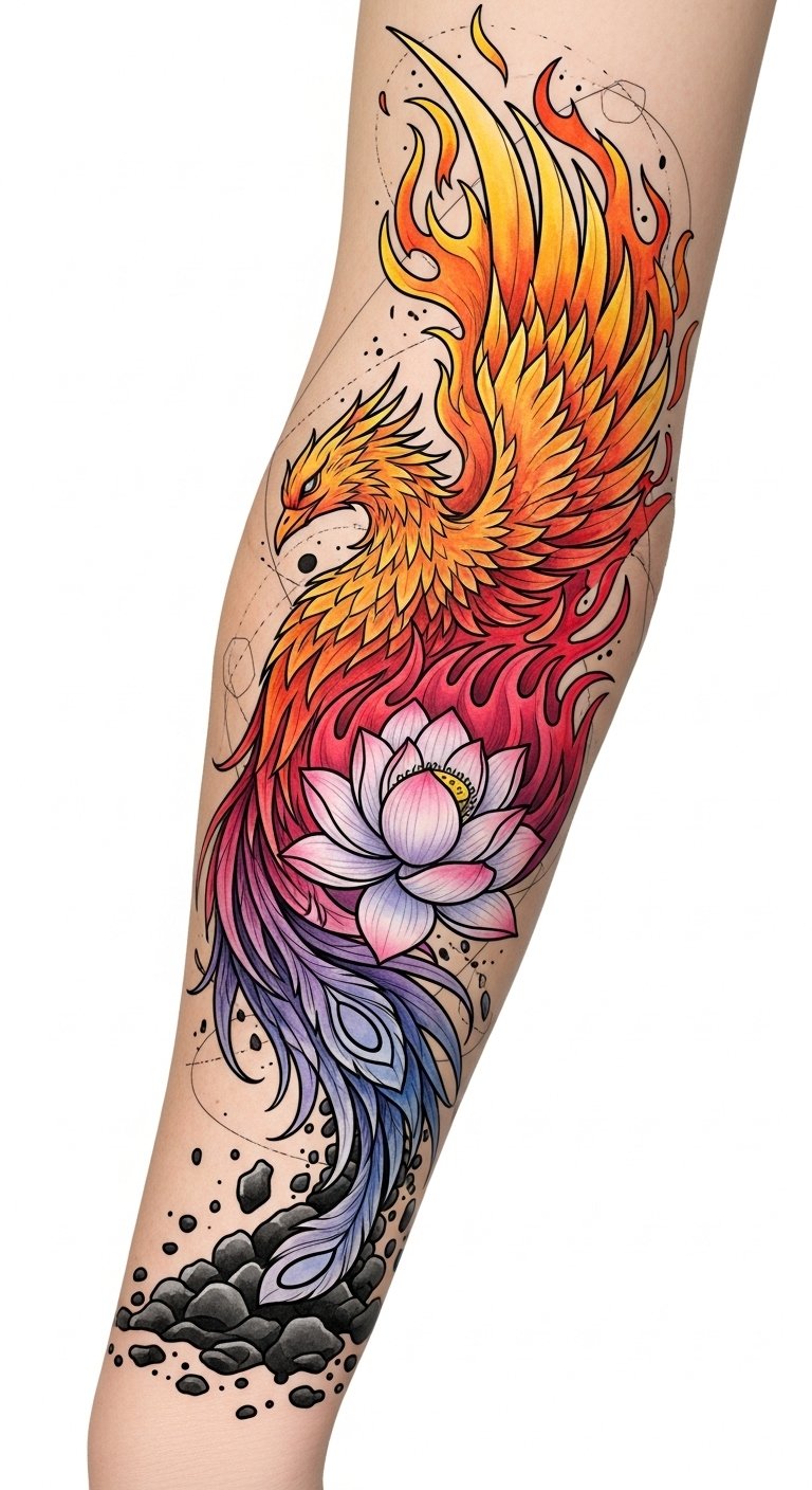 This design fuses the phoenix and lotus to symbolize cyclical renewal and inner resilience; the watercolor flames convey emotional intensity and healing, while fine-line and geometric elements suggest structure and personal growth.