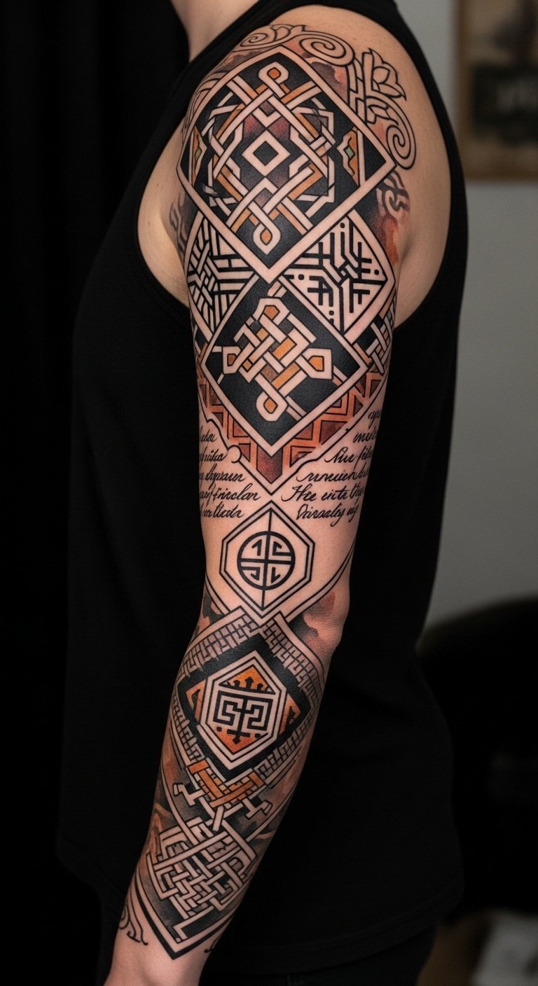 This sleeve concept uses layered motifs to symbolize lineage (ancestral symbols at the shoulder), personal journey (interlaced patterns along the arm), and present self (flowing script near the wrist), evoking pride, continuity, and introspective calm; ideal placement along the arm allows the imagery to move with the body, creating an emotional narrative visible in motion.