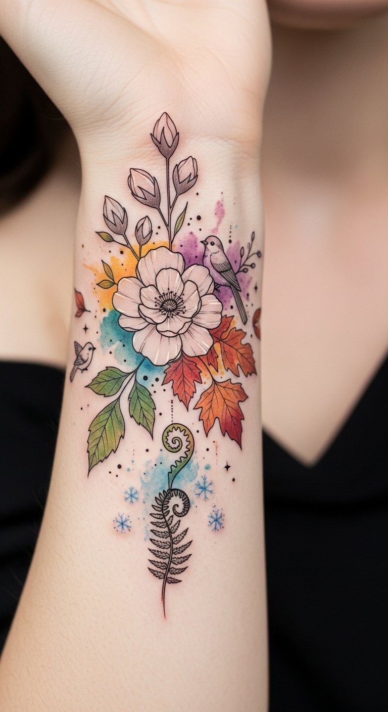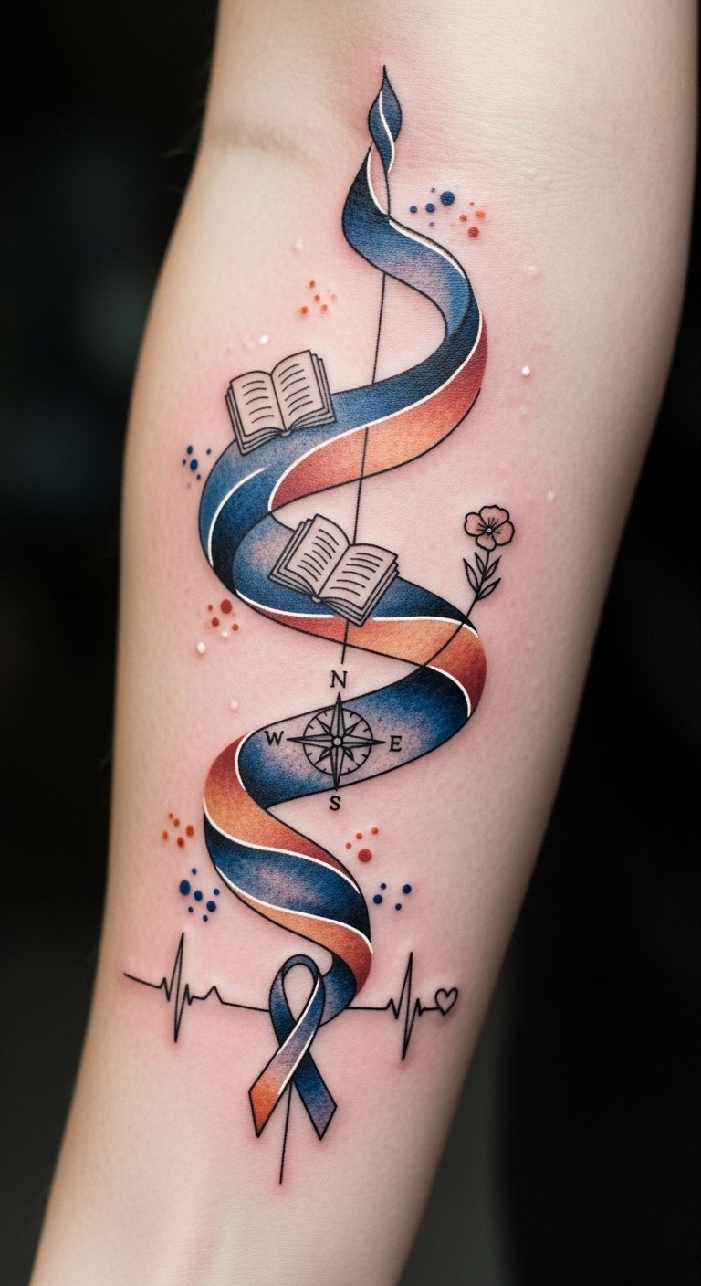 The watercolor ribbon represents the fluidity of life’s path, indigo for introspection and sienna for warmth and resilience; the book symbolizes learning, the compass rose guidance, the birthflower personal origin, and the heartbeat line enduring vitality—the inner forearm placement keeps these elements intimate yet visible, allowing daily reflection and subtle sharing of your narrative.