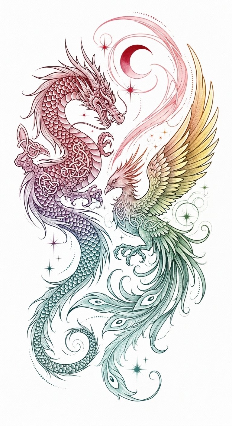 The dragon and phoenix entwined symbolize dual forces—power and rebirth—conveying resilience and continuous transformation; the watercolor hues evoke passion (crimson), renewal (gold), and healing (teal), while Celtic knot accents suggest interconnected fate and continuity.