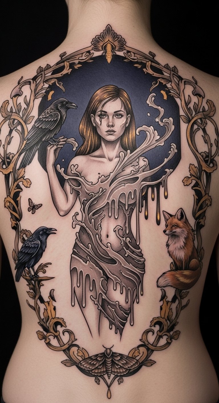 Embrace this freedom to express your individuality through unforgettable gallery-worthy tattoos that captivate all who see them. This design blends museum-like grandeur with intimate storytelling: the woman symbolizes the wearer’s inner narrative, the dripping paint suggests fluid identity, and the raven, fox, and moth represent intellect, cunning, and transformation.