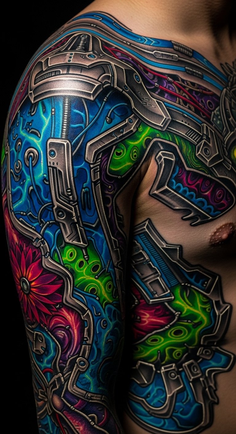 A wearer-centered design combining a partial biomechanical sleeve with neon-infused circuitry flowing into organic vine-like tendrils: chrome plating, exposed gears, and soft muscle textures merge with glowing cyan and magenta light veins, punctuated by micro-LED-like dots; include a focal implant over the clavicle or forearm that looks like a power core. Symbolically this piece balances humanity and machine—freedom through self-crafted identity, resilience through visible mechanics, and hope via bright colors. Emotionally it reads as defiant and visionary; ideal placement is the forearm or shoulder wrapping toward the chest for visibility and narrative flow.