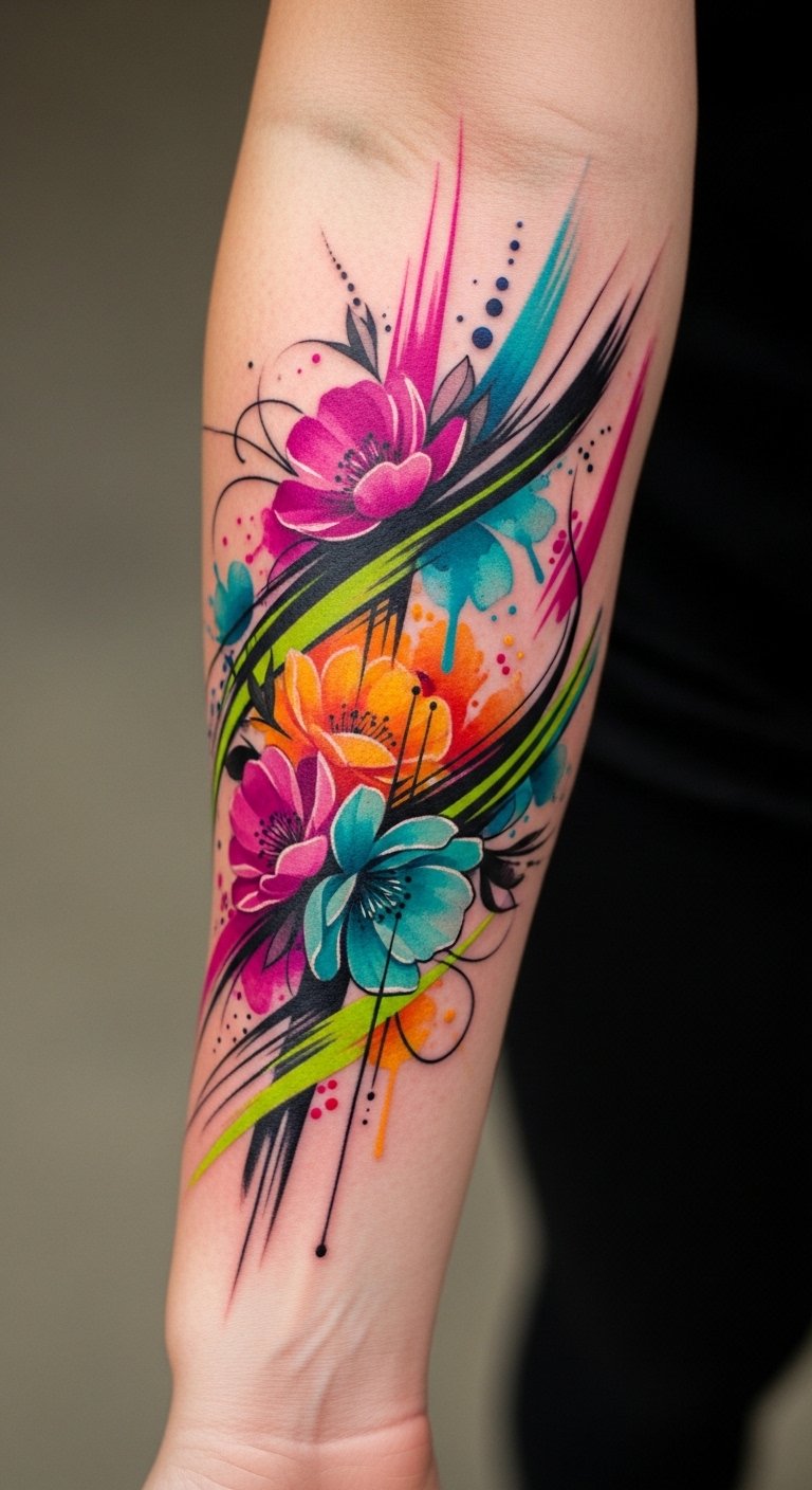 Emotionally it reads as joyful defiance and soulful expression, ideal for a forearm placement where the flowing composition follows the muscle line and can be shown or concealed easily, allowing the wearer to display their vibrant identity and evolving story.