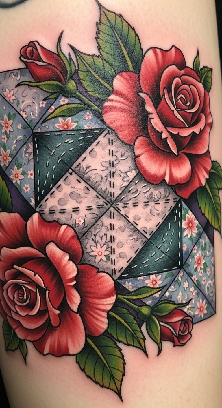 Embracing the delicate beauty of a floral quilt block with roses, this tattoo design weaves together vibrant petals and intricate stitching, creating a harmonious blend of nature and craftsmanship. Each rose carries profound meanings, symbolizing love and passion, while the floral symbolism reflects your unique journey. This enchanting artwork celebrates freedom, inviting you to express your individuality through the enchanting language of flowers. Consider placement on the upper arm or back where the block’s square shape can be framed; the design evokes warmth, nostalgic comfort, and gentle strength, suitable for someone marking personal growth, love, or a tribute to family traditions.