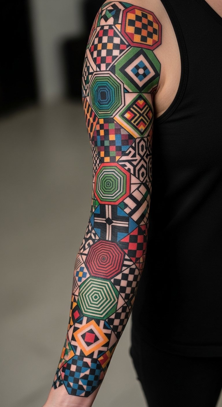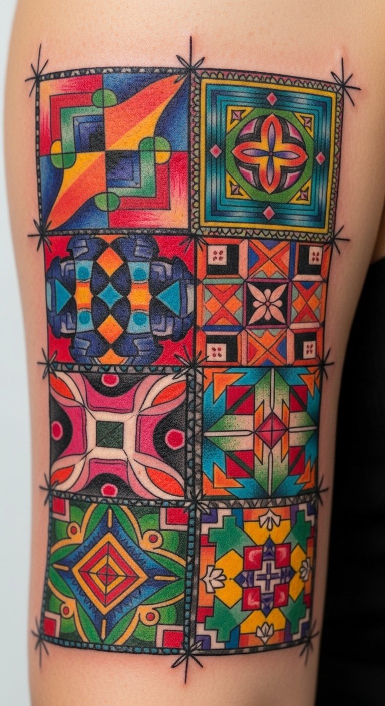 Symbolically it honors heritage and personal narrative—each colored patch representing a memory or value—while the bold palette communicates confidence and joy. Emotionally the tattoo reads as celebratory and affirming; ideal placements include the upper arm wrap, shoulder blade, chest panel, or thigh, where the composition can flow with the body and allow for future additions.