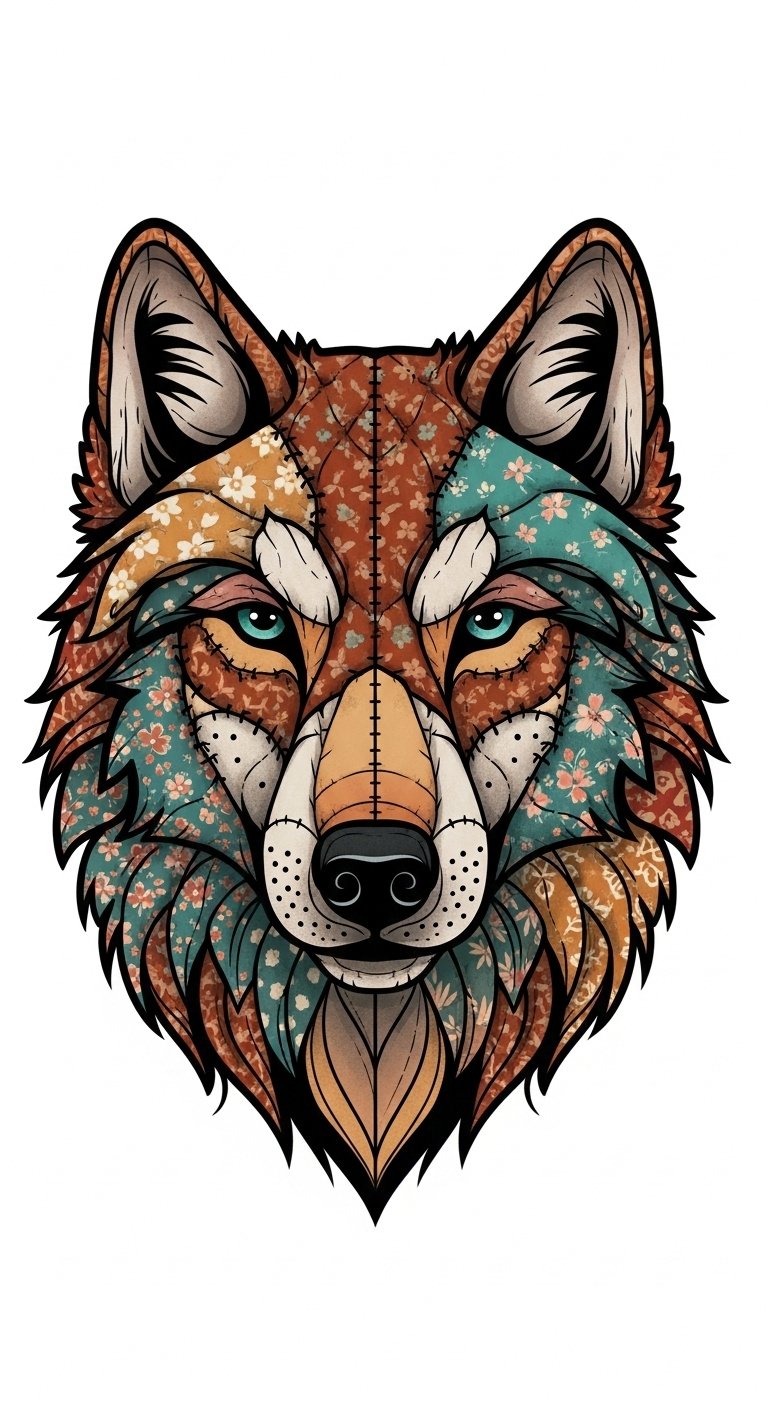 The wolf motif in quilt style brings a fierce yet comforting presence to tattoo art, blending nature’s raw beauty with the warmth of patchwork design.