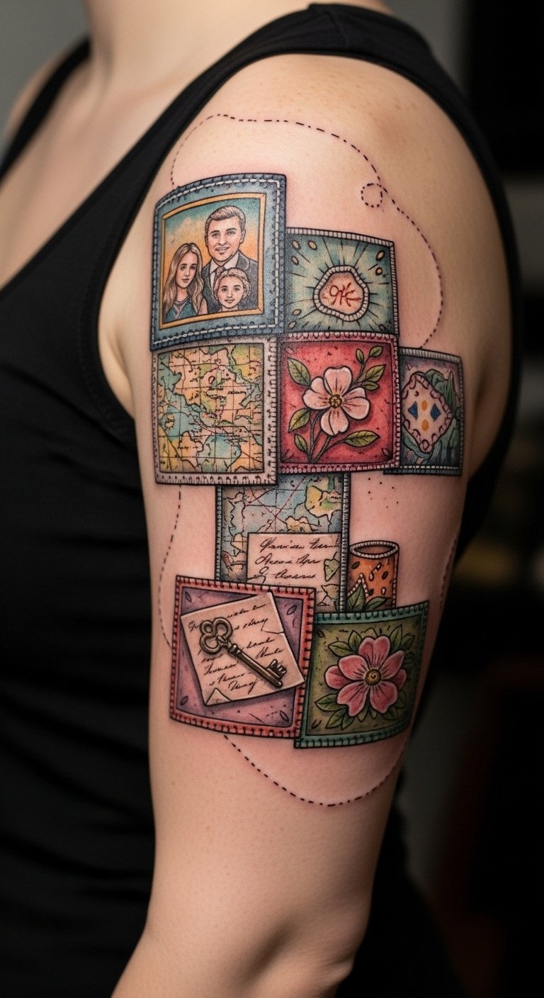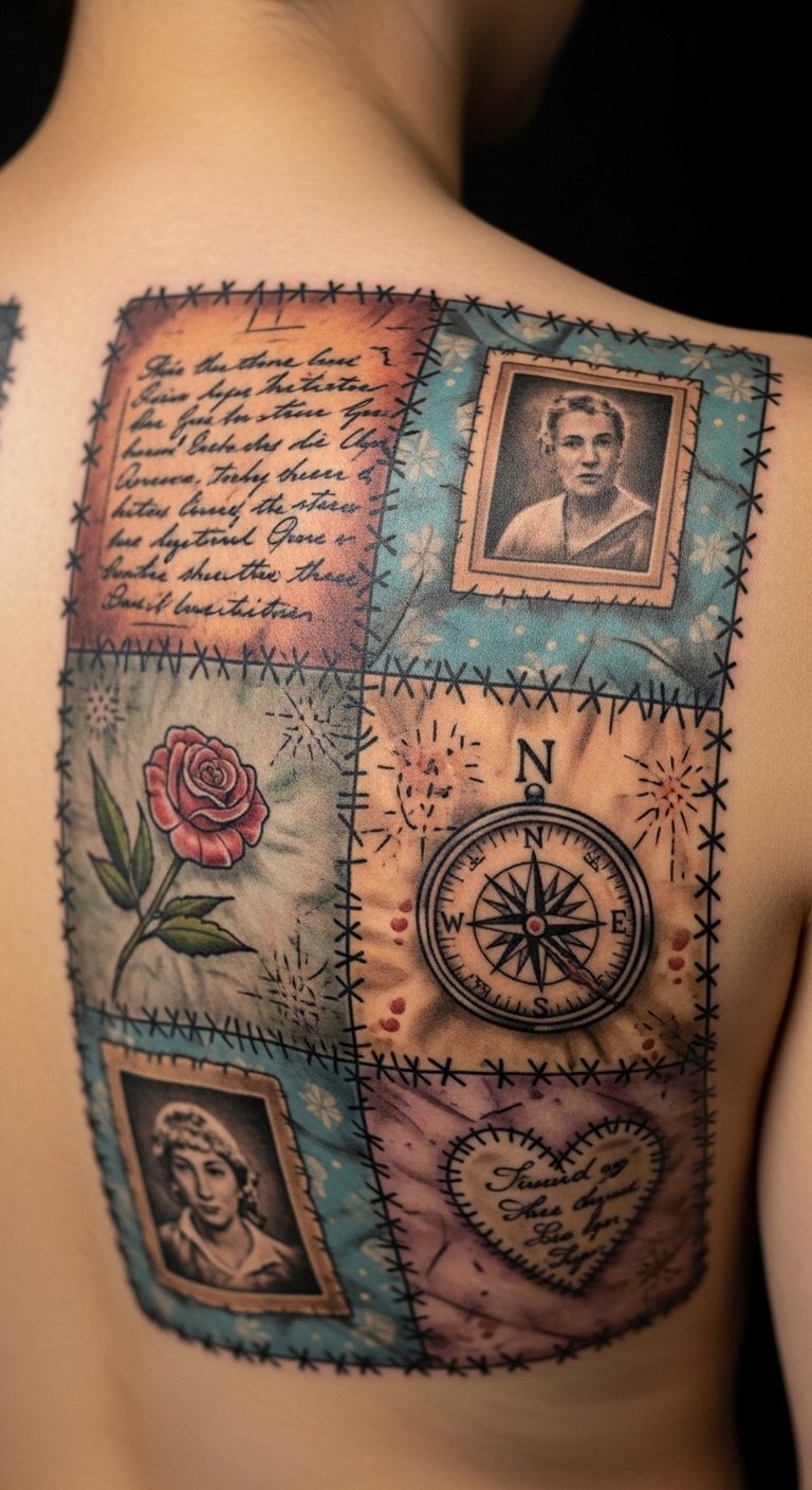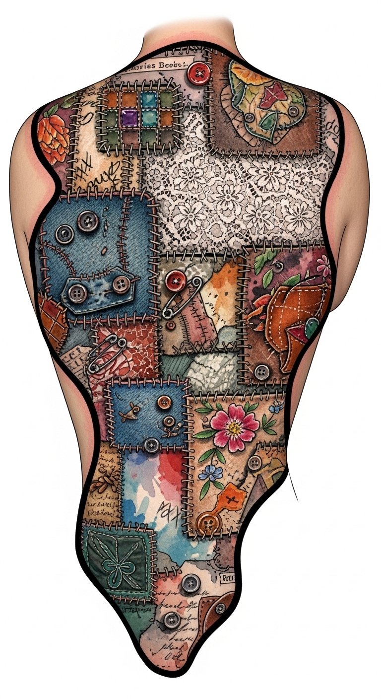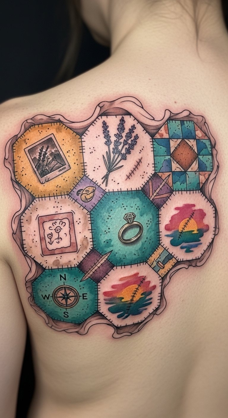 You can incorporate patterns, colors, and images that resonate deeply, creating a stunning expression of affection and remembrance that celebrates your unique journey through life. This design evokes nostalgia and tenderness: each patch holds a memory, the visible stitches bind past and present, and the color washes suggest emotional warmth; ideal placement spans the upper back and shoulders so each square can be seen as a chapter, with curved borders following the shoulder lines to make the piece feel embraced by the body.
