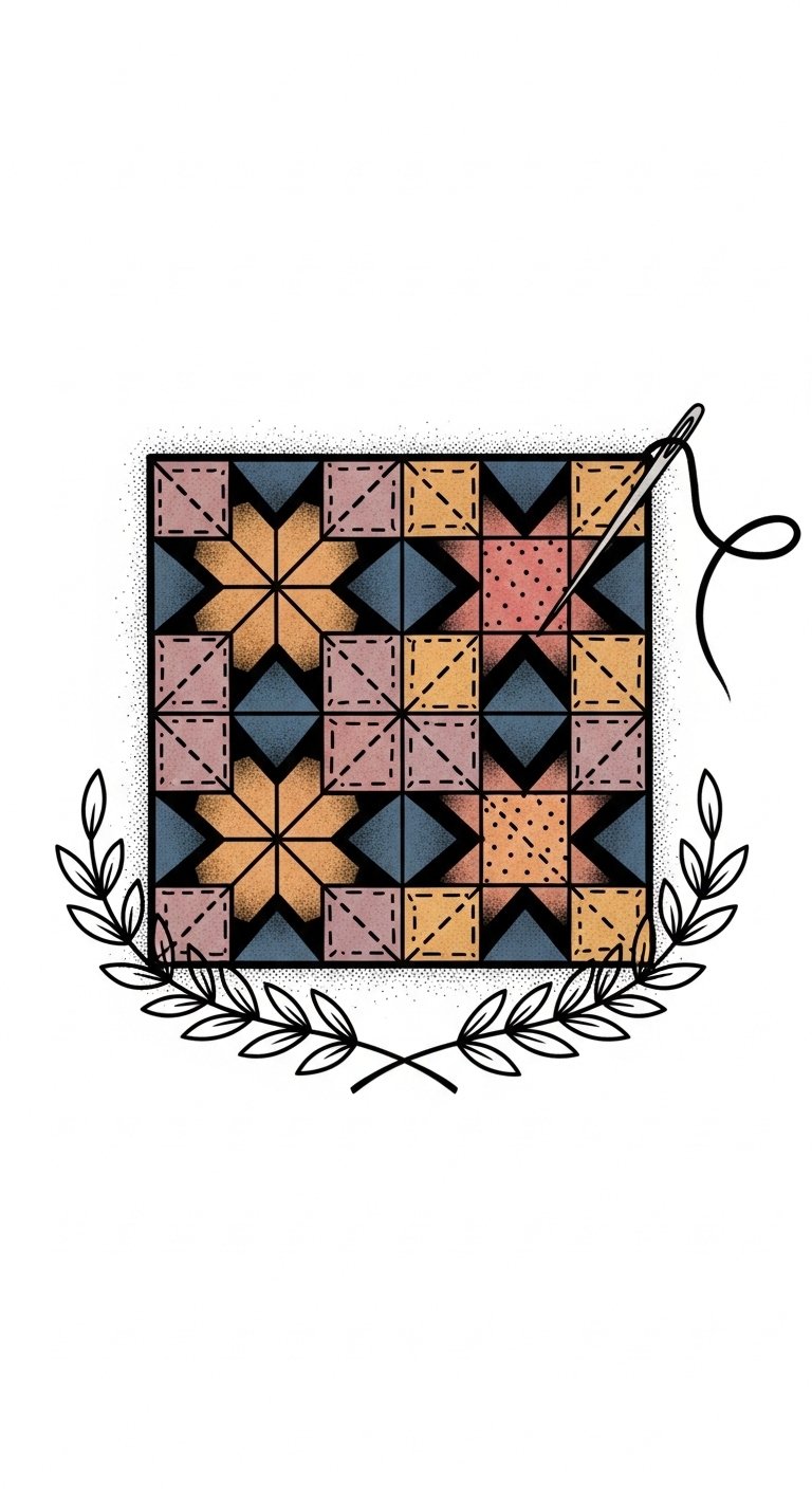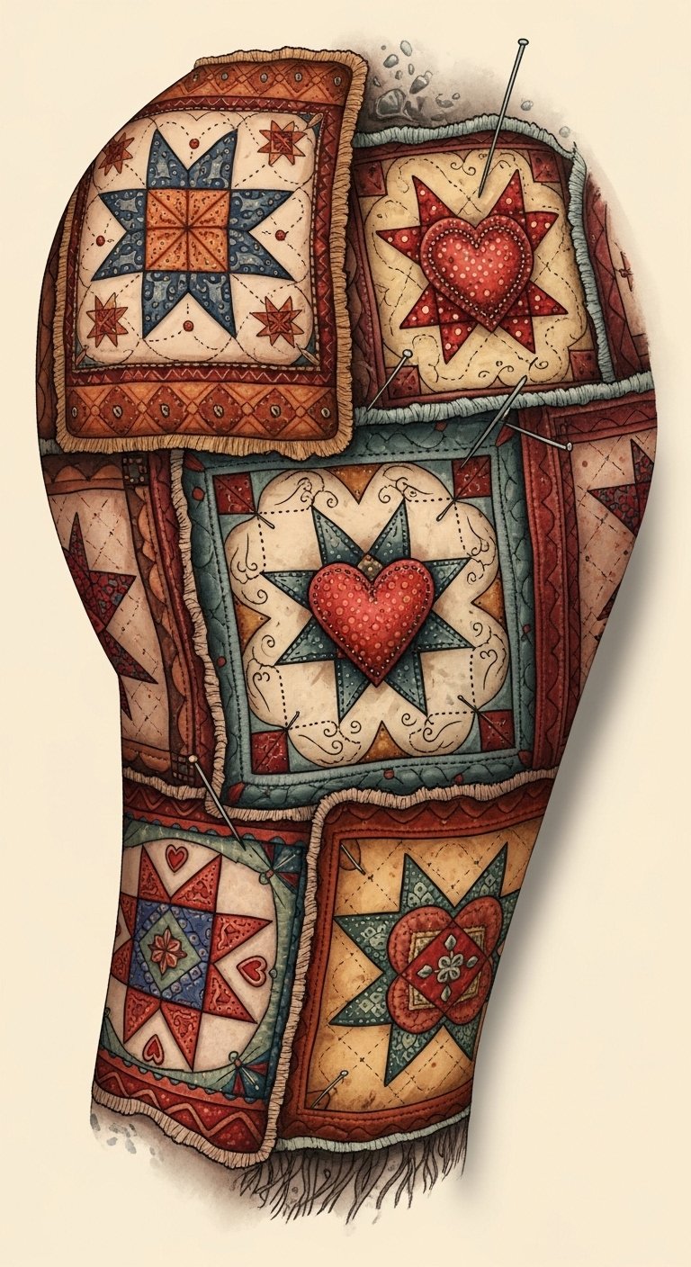 This tattoo concept uses quilt panels flowing with the body’s natural lines—wrap-around forearm, shoulder blade, or along the ribs—so the star and heart motifs act as focal anchors while stitchwork and patterned borders guide movement; symbolically it celebrates heritage, handcrafted care, and personal narrative, evoking warmth, connection, and resilience while allowing for color choices that range from vintage muted tones to bold folk-palette accents to match emotional intent.