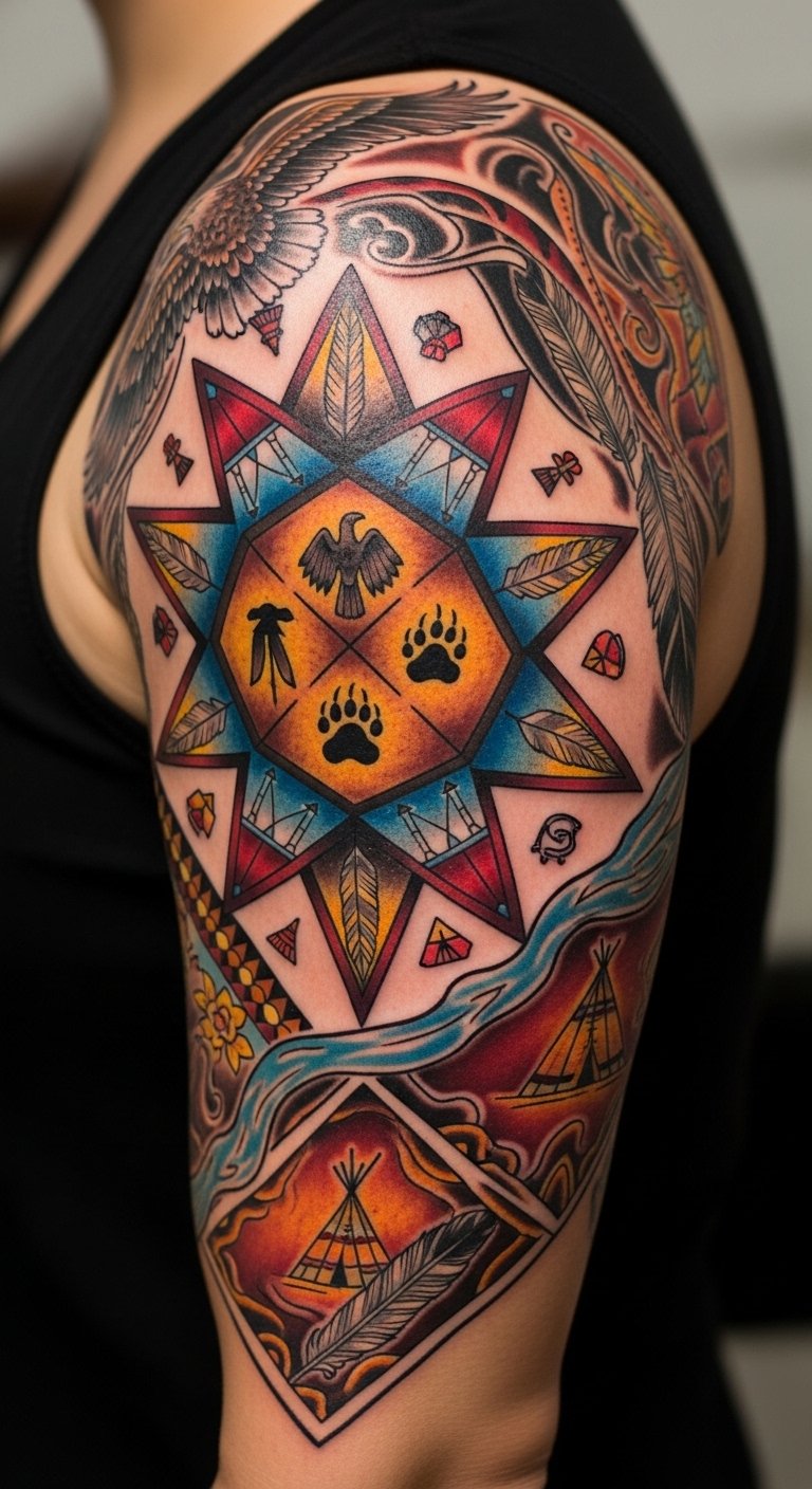 This tattoo concept draws on traditional star quilt geometry interwoven with stylized prairie motifs and soft feather accents, rendered in bold black lines with selective color blocks of indigo, turquoise, and crimson to honor cultural palettes; its symmetrical star radiates from a central circle, with smaller panels around telling personal stories—ideal for a chest, back, or upper arm placement where the piece can breathe and be seen. The design evokes reverence and continuity, intended to communicate respect for ancestry, resilience, and connection to community while offering a space for personal symbols to be integrated, creating emotional resonance through placement close to the heart or across the shoulder to symbolize protection and belonging.