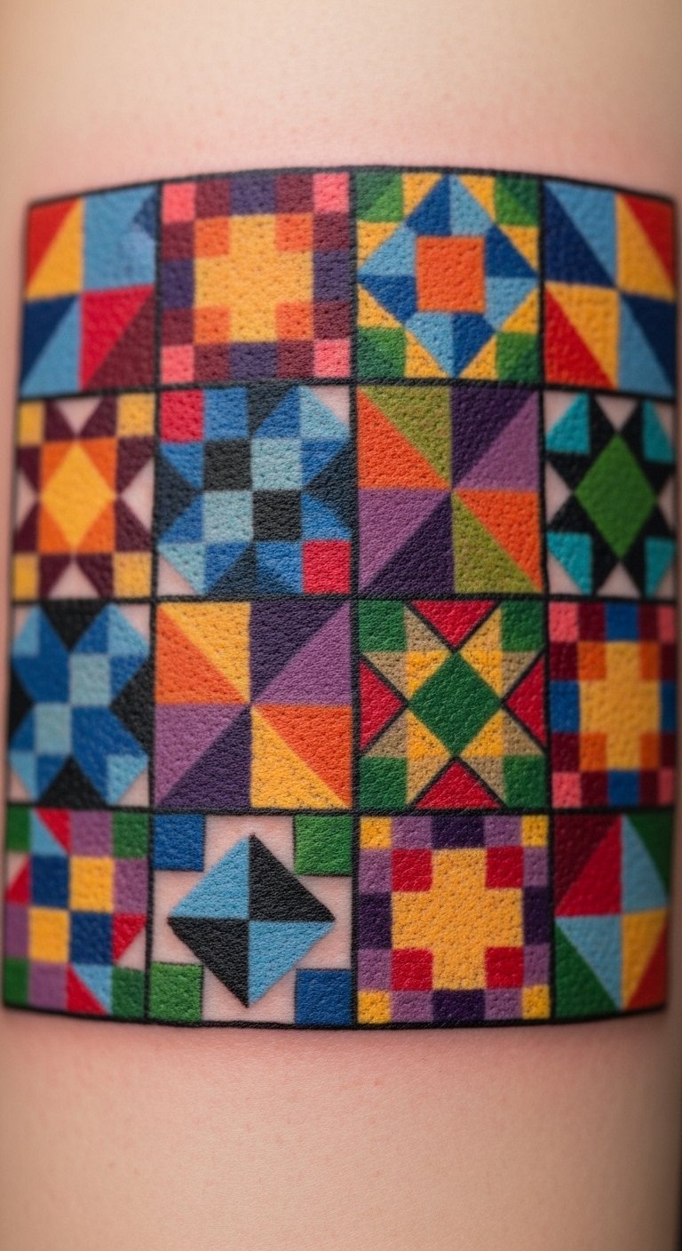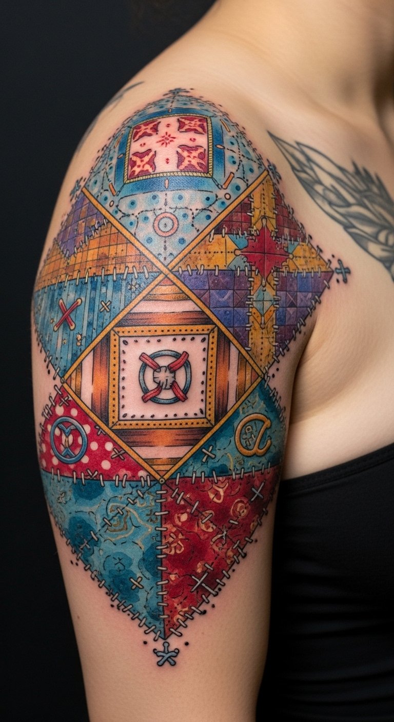 Place the design over the upper arm or across the shoulder blade so the quilted squares can flow with the body’s contours; use bold, saturated inks with subtle shading to create a stitched, textured effect.