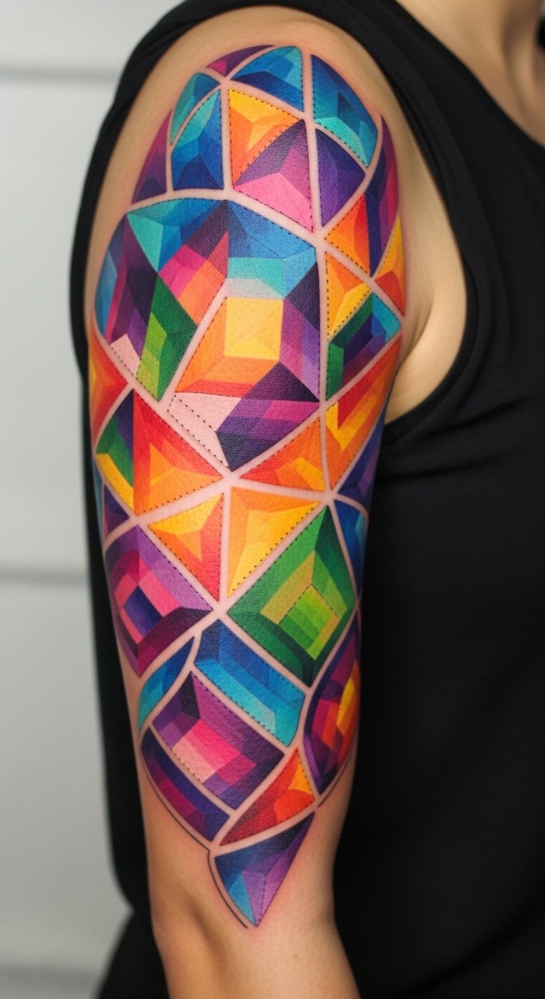 A Triangular Patchwork Tattoo captures the essence of individuality through a striking arrangement of interlocking triangles, each telling its own story.