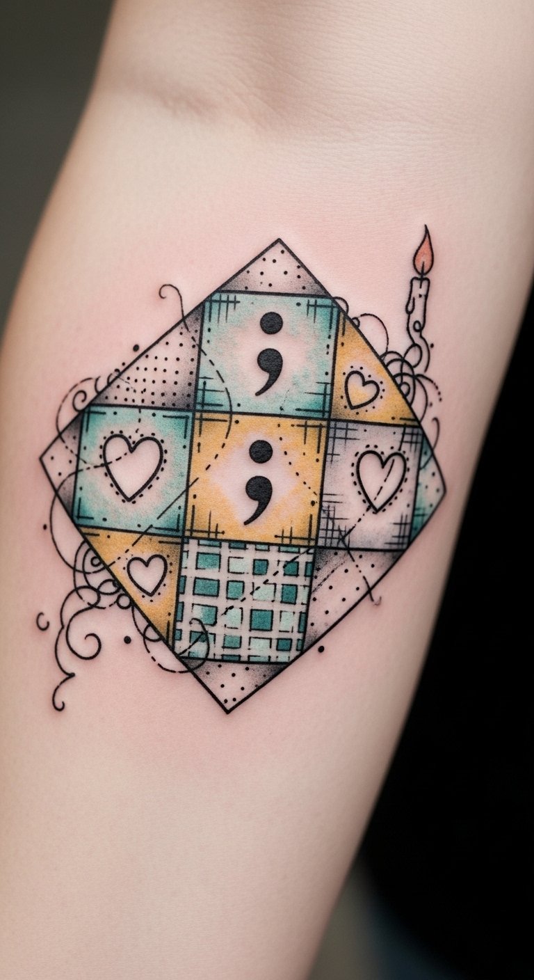 The composition blends traditional quilting symbolism—interlocking patches and stitched seams—with the semicolon as a discreet emblem of continuity and the candle flame as a beacon of life; its soft palette evokes calm and affirmation, while the fine-line detail keeps it intimate and wearable on the forearm, upper chest, wrist, or shoulder, communicating quiet strength and opening space for dialogue.