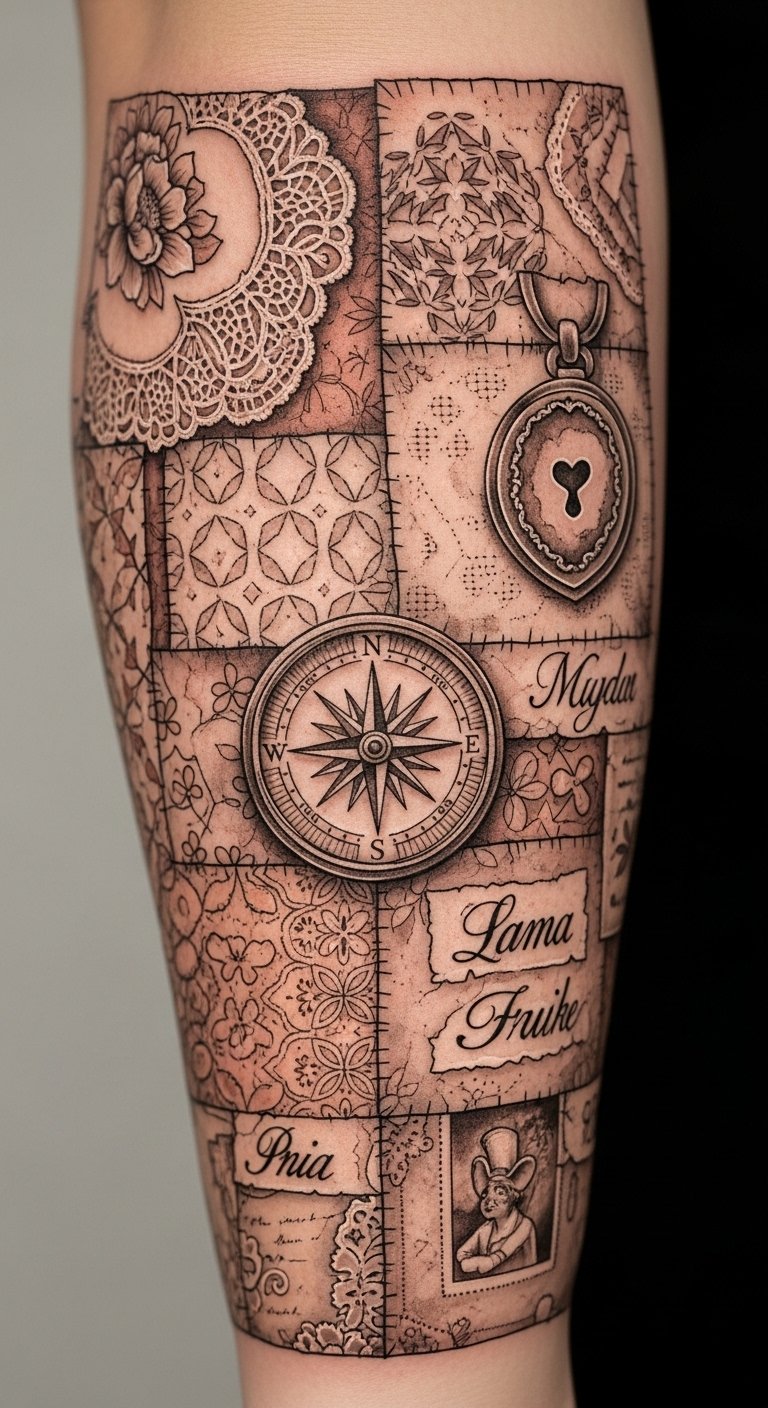 Consider placement across a 3/4 sleeve to wrap narratives around the arm or as a back panel for a larger storytelling field; symbolism comes from each fabric choice—lace for fragility, denim for resilience, leather for protection—evoking nostalgia, empowerment, and continuity as the layers overlap like chapters of a life.