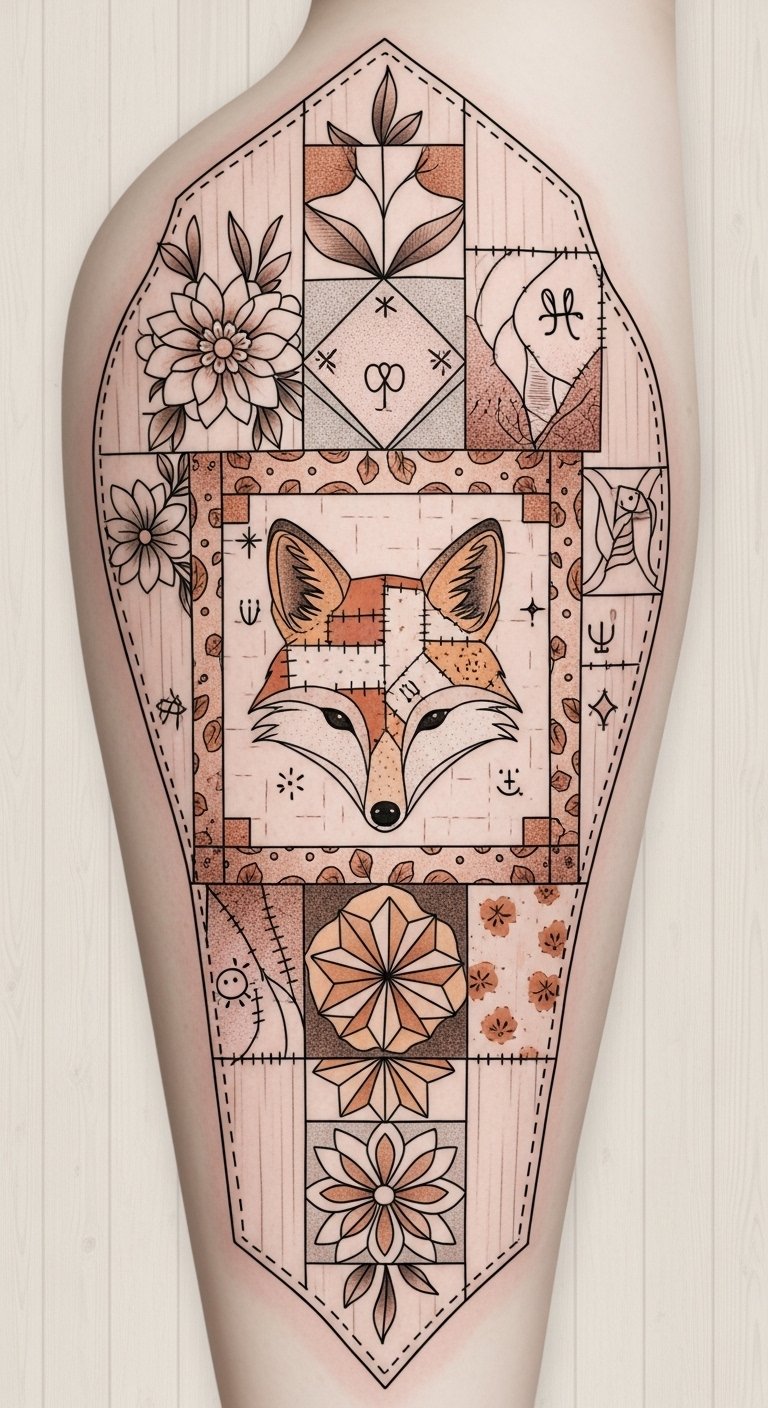 Place on the forearm for daily visibility and personal reminder, or on the upper back for a larger, narrative composition; the fox symbolizes cleverness and adaptability, while the quilt blocks evoke comfort, heritage, and stitched-together life experiences, creating an emotional balance between resilience and warmth.