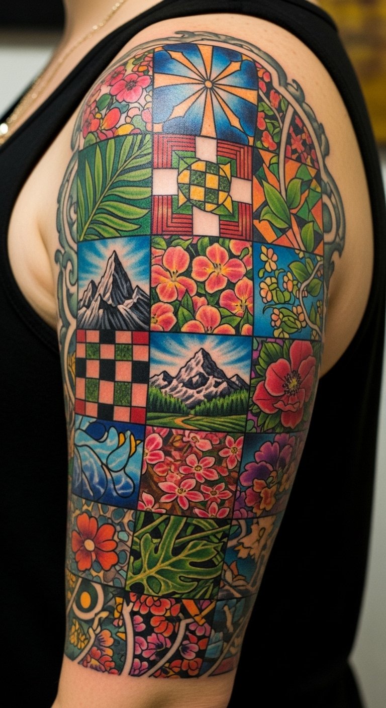 Each patch symbolizes heritage and individuality, blending nostalgia with contemporary style to express growth and resilience; the grandmother’s flower garden conveys familial roots and warmth while the geometric blocks represent personal evolution and structure, together evoking emotional continuity and a layered life story—ideal placement wrapping the forearm toward the shoulder so the narrative unfolds as the wearer moves, with hidden initials or dates sewn into seams for intimate personalization.