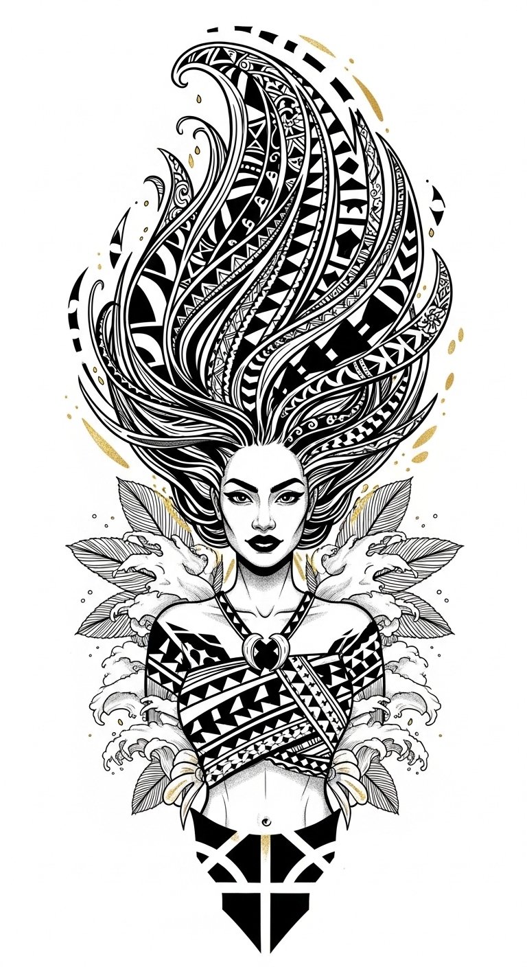 Incorporate Taema’s flowing hair transforming into malu and pe’a motifs to symbolize continuity between the divine and the community; coconut leaves and ocean waves frame the figure to evoke connection to land and sea and the rootedness of Samoan identity.