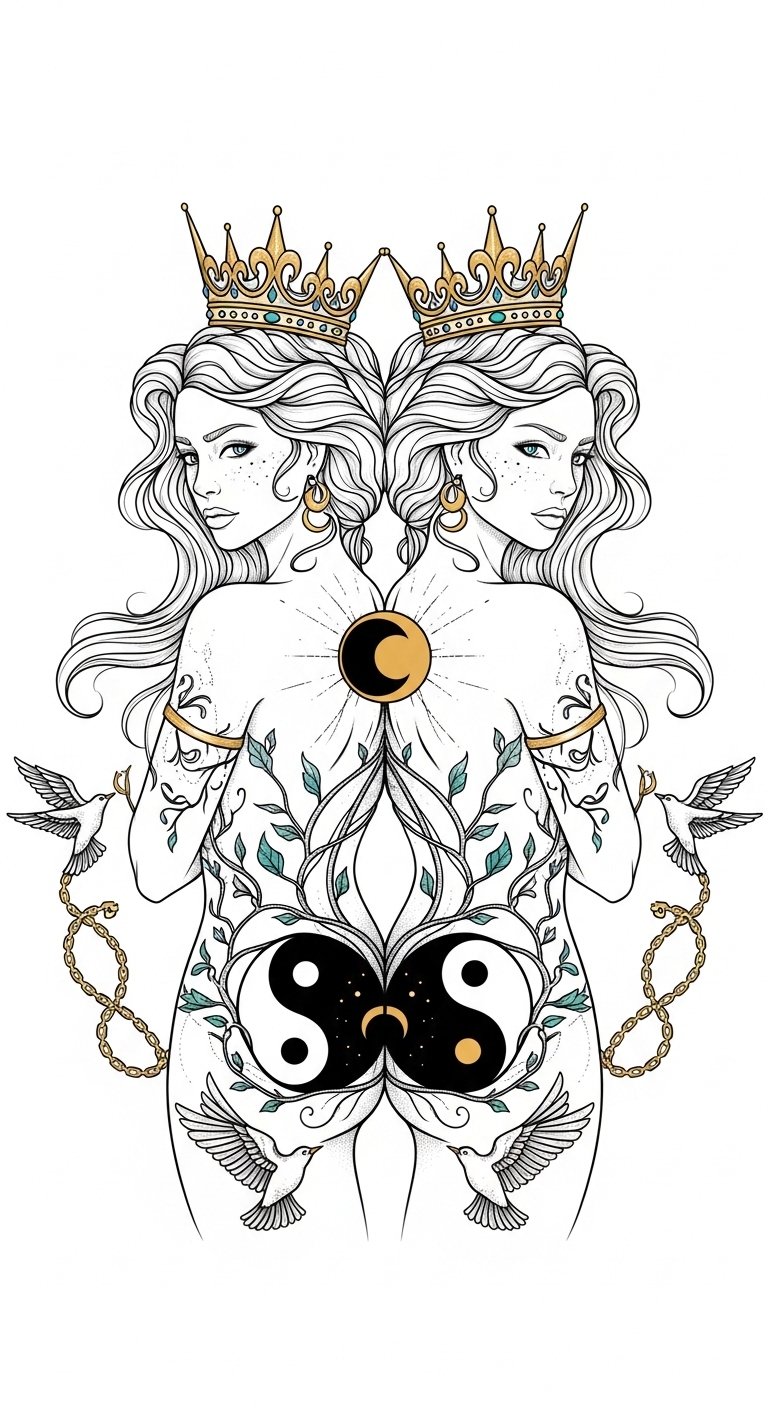 This design evokes deep connection and duality—strength found in union rather than solitude. The mirrored figures convey balance and mutual support while the vines and celestial motifs suggest growth and destiny.