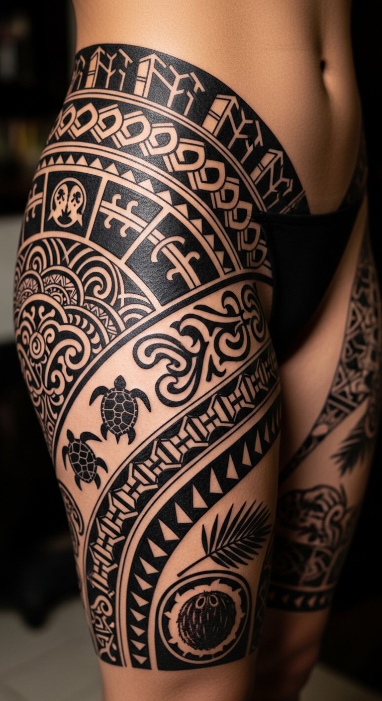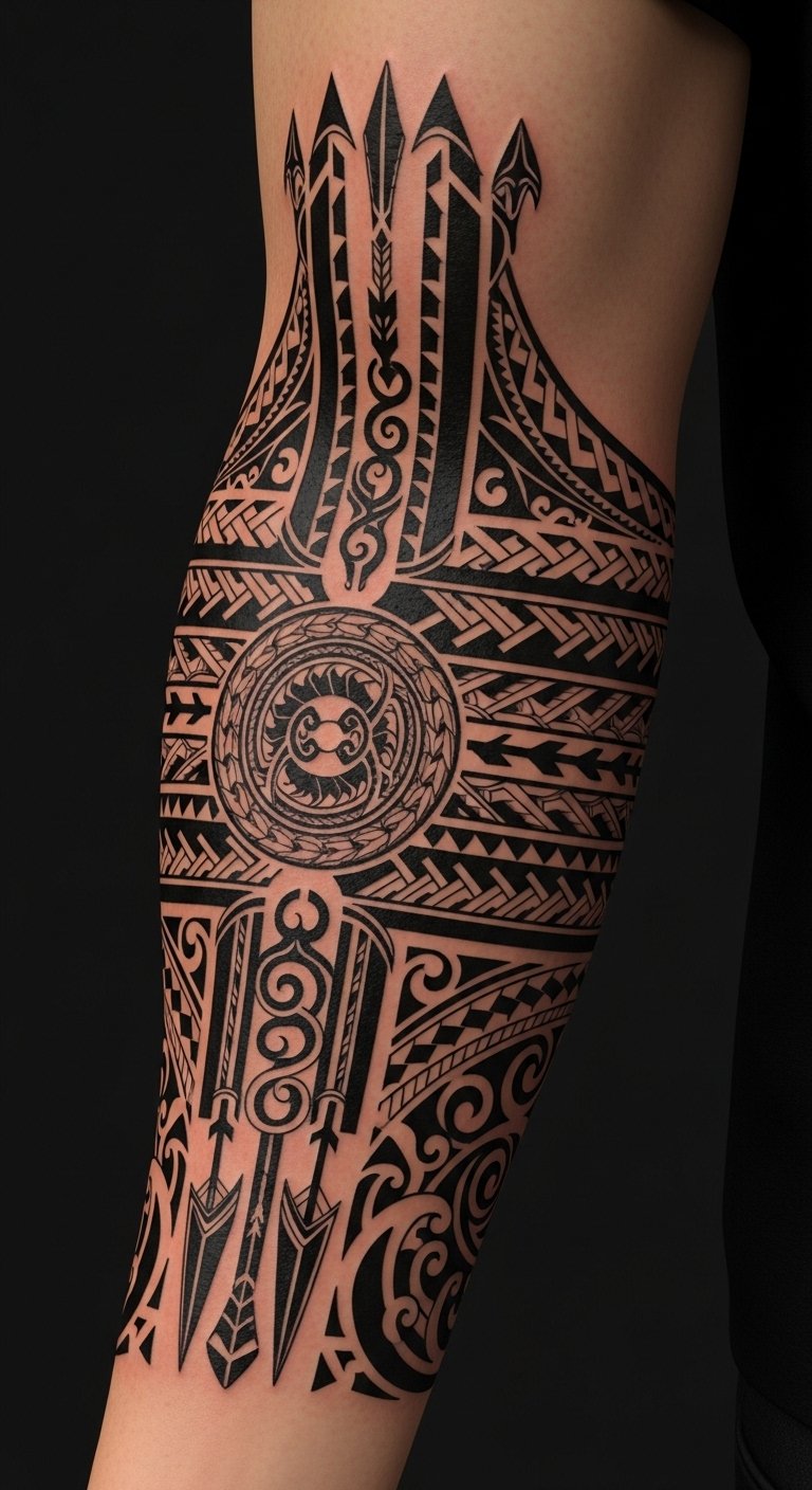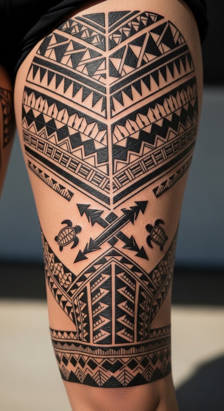 This design places those themes on the thigh and calf to evoke strength and movement—spearheads for protection and duty, waves for connection to the sea and lineage, turtles for longevity and navigation, and interlocking motifs to represent community ties.