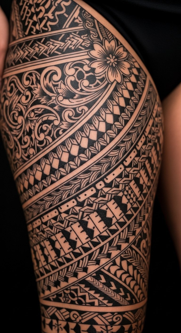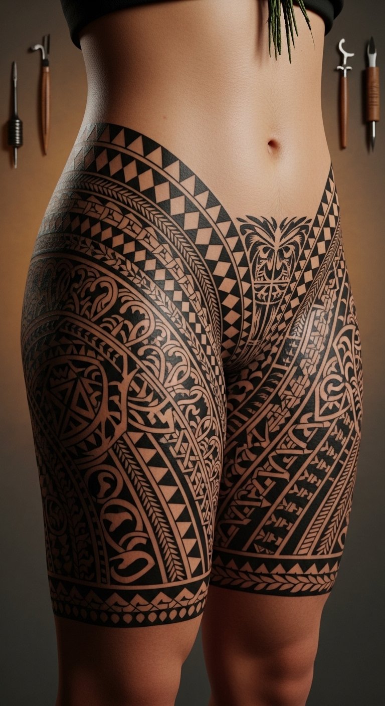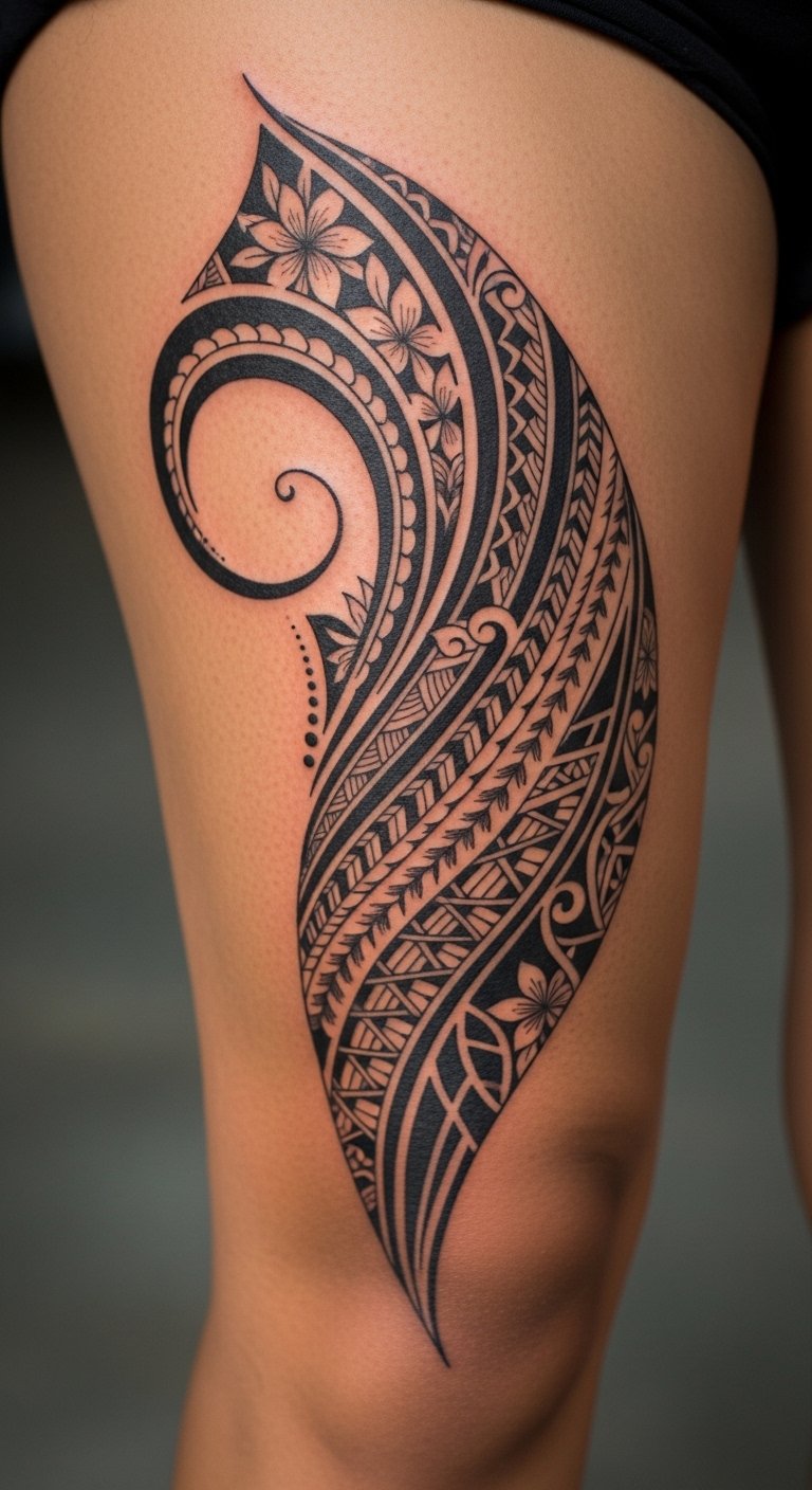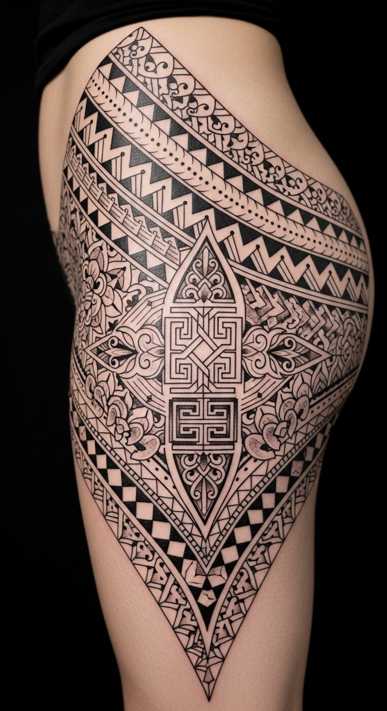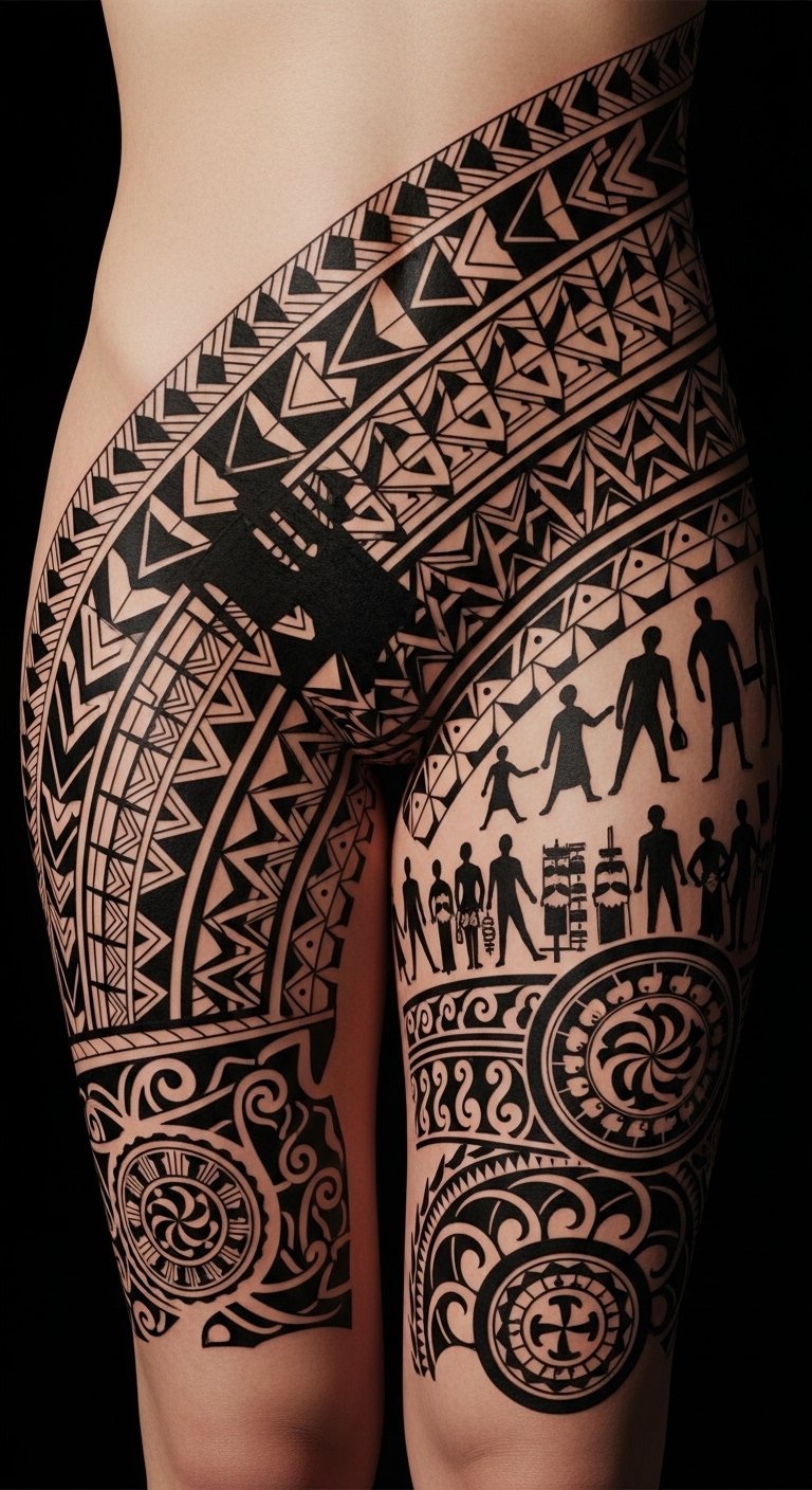 Place the piece along the lateral thigh and upper leg to honor traditional placement; the motifs evoke protection and communal ties, the flowing curves convey grace and movement, and the dense geometric areas balance softness with strength, creating an emotional resonance of pride, dignity, and personal lineage.