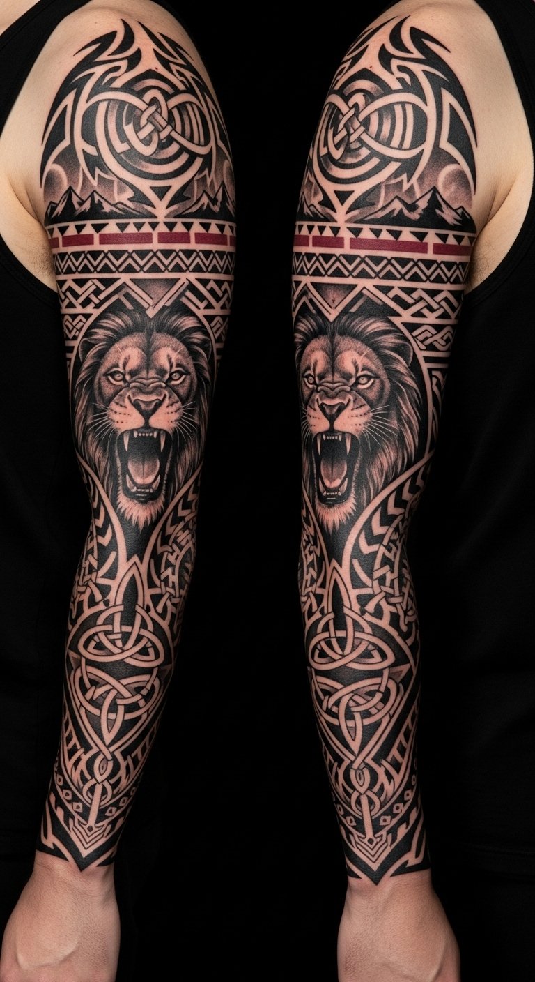 From intricate patterns to bold imagery, these tattoos serve as a canvas for your identity, celebrating the freedom to express who you truly are. The design combines symbols of courage (lion), ancestral connection (Celtic knots and tribal motifs), and personal journey (mountain silhouettes) to evoke resilience and legacy; emotionally it balances fierceness with introspective heritage.