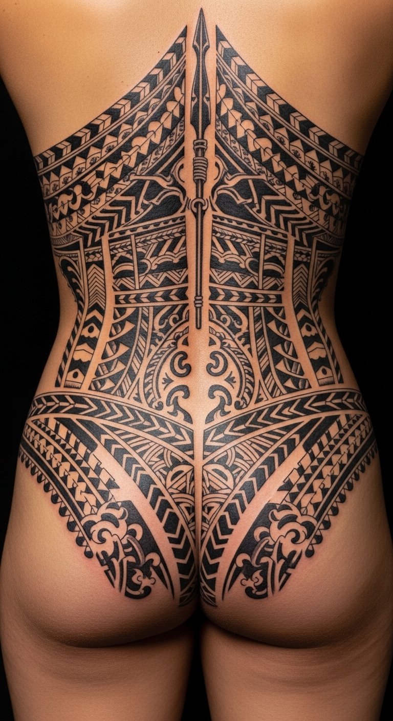When placed over the lower back and wrapping slightly to the sacrum and hips, this design channels the lumbar symbolism of strength and resilience through bold Samoan motifs—interlocking tapa patterns, spearheads, waves, and a central koru-inspired spiral to suggest growth and continuity.