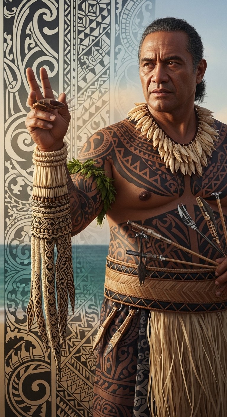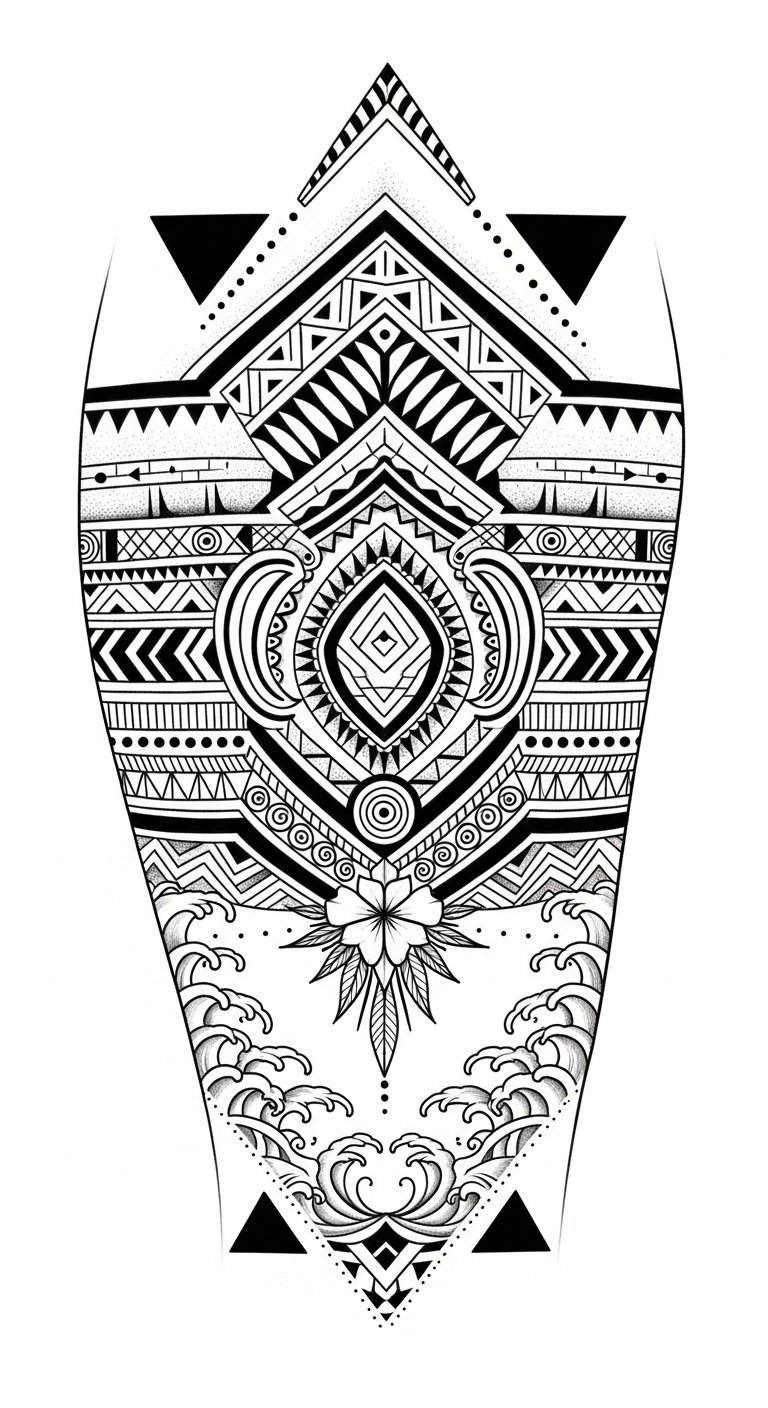 This design concept places the bold geometric motifs and ancestral emblems along the torso and down the thighs to follow traditional placement, evoking resilience and lineage; the ocean and coconut frond elements symbolize life, sustenance, and guidance, while the hand-tapped tool gesture in the composition conveys ritual, endurance, and pride—suitable for a wearer seeking a visible statement of identity and duty.