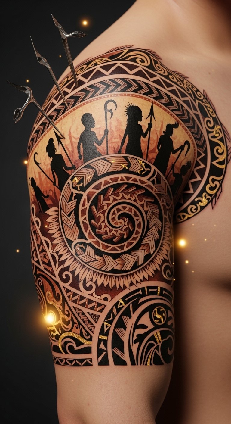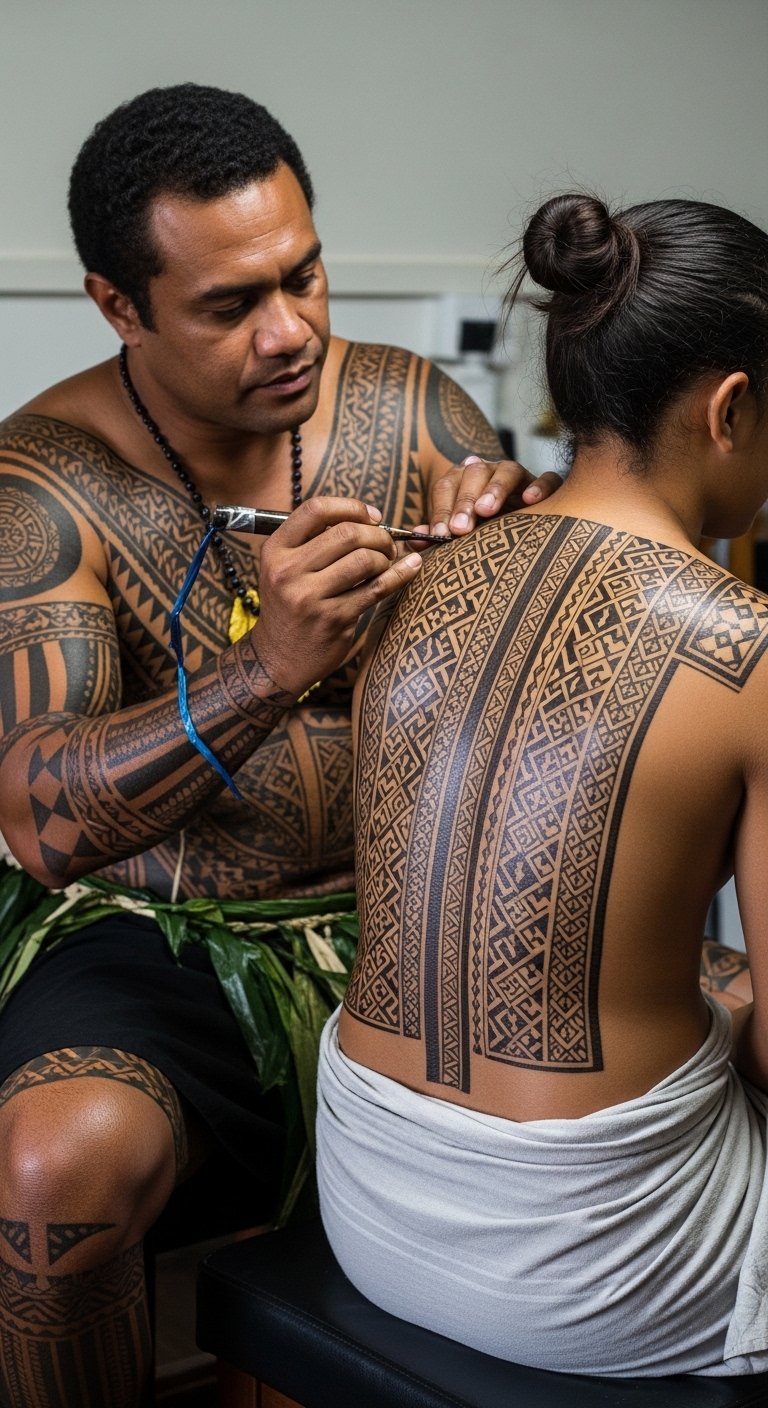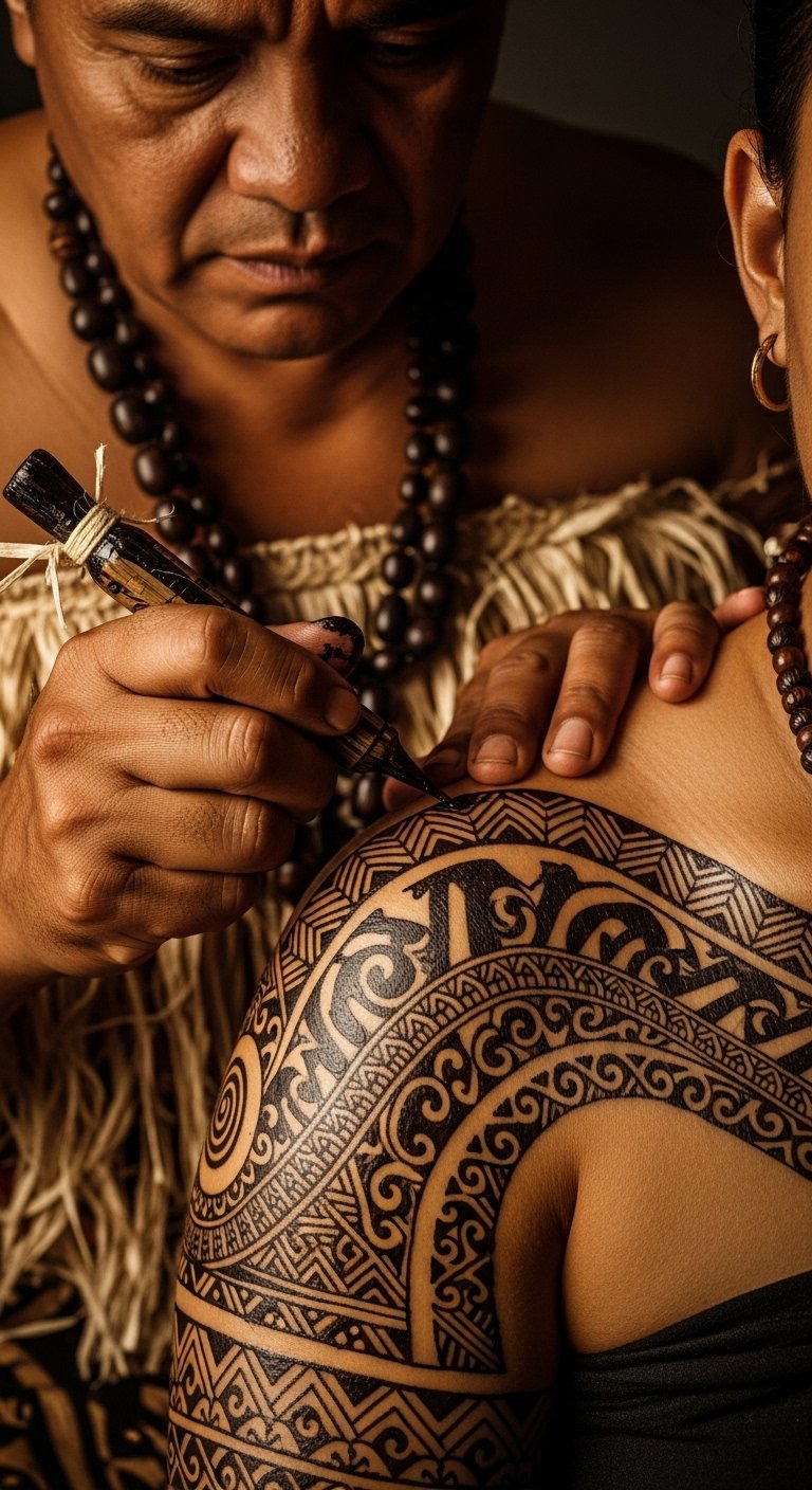 The composition’s motifs and tools symbolize lineage, responsibility, and the passage of knowledge; the warm tones and soft light convey reverence and quiet strength; placement focused on the forearm and torso references traditional pe’a and malu locations, suggesting personal commitment and communal belonging.